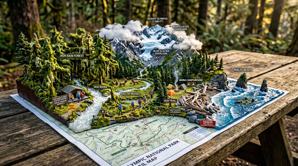 A National Park trail map unfolded on a picnic table, with the wilderness rising into explorable miniature ecosystem. {TRAILHEAD} emerges with {VISITOR_ELEMENT}, the marked paths wind upward through {TERRAIN_1} featuring {WILDLIFE_1}, past {VIEWPOINT_1} with {SCENIC_ELEMENT}, toward {SUMMIT/DESTINATION} with {PAYOFF_VIEW}. {WATER_FEATURE} flows actual water down the topography. {FOREST_TYPE} trees stand at proper scale, {BIRD_SPECIES} perch in branches. Trail markers and signs are legible. Elevation changes create dramatic miniature mountains. {WEATHER_ELEMENT} affects one region while another stays clear. Camping symbols mark actual tiny tent sites with smoke rising. Day hikers frozen mid-stride, wildlife pausing mid-graze. Golden hour backcountry light, wilderness diorama perfection, 8K, the park as you imagined it from the map.Related Nano Banana Pro Prompts