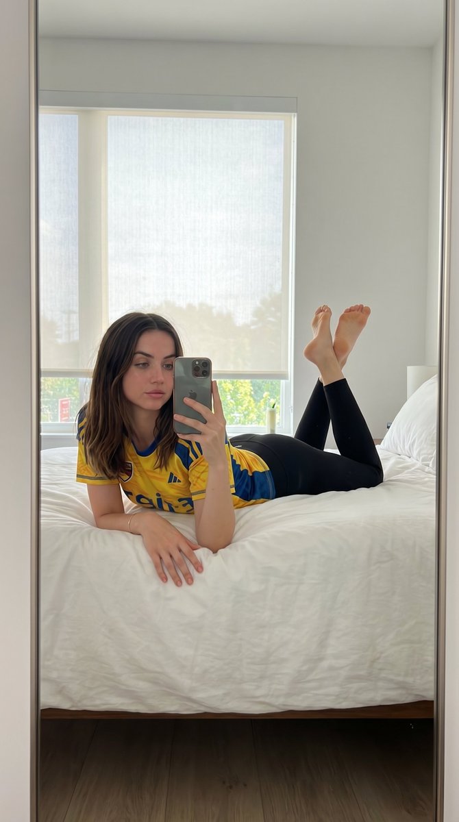 "pose": "lying on stomach on bed, legs bent upward at knees with feet crossed in air, one arm extended holding phone for mirror selfie, relaxed posture",