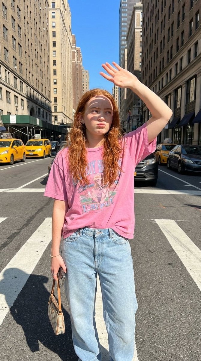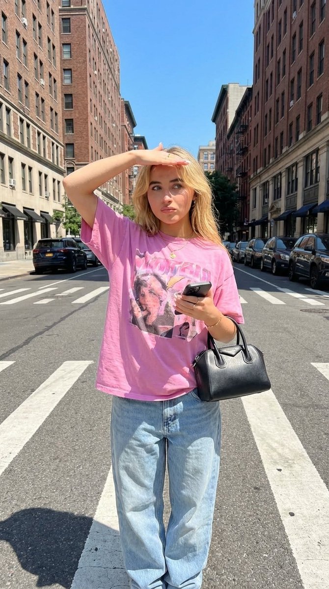 full body photo of a stylish young woman standing on a New York City street crosswalk, surrounded by tall buildings and parked cars, bright sunny day with clear blue sky, strong natural sunlight creating sharp shadows, outfit: oversized pink graphic t-shirt, light wash baggy denim jeans, minimal jewelry, holding a small handbag and phone, pose: casual confident pose, one hand raised over head blocking sunlight, playful expression with slight pout, looking to the side, relaxed street attitude, environment: NYC street, crosswalk lines, cars and buildings in background, urban lifestyle setting, lighting: harsh midday sunlight, high contrast, warm highlights, natural shadows, camera: iPhone candid style, slightly wide angle, realistic skin texture, sharp focus, style: street fashion editorial, influencer aesthetic, no text, no watermark, no logo --ar 2:3 --style raw --v 7 --stylize 100