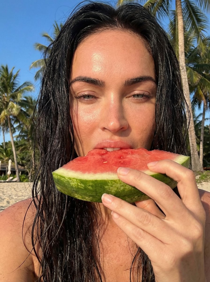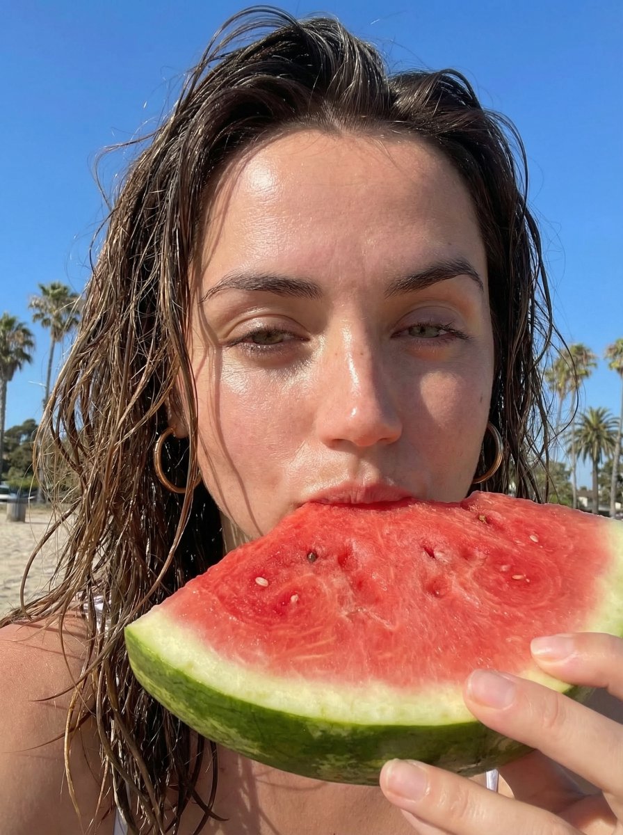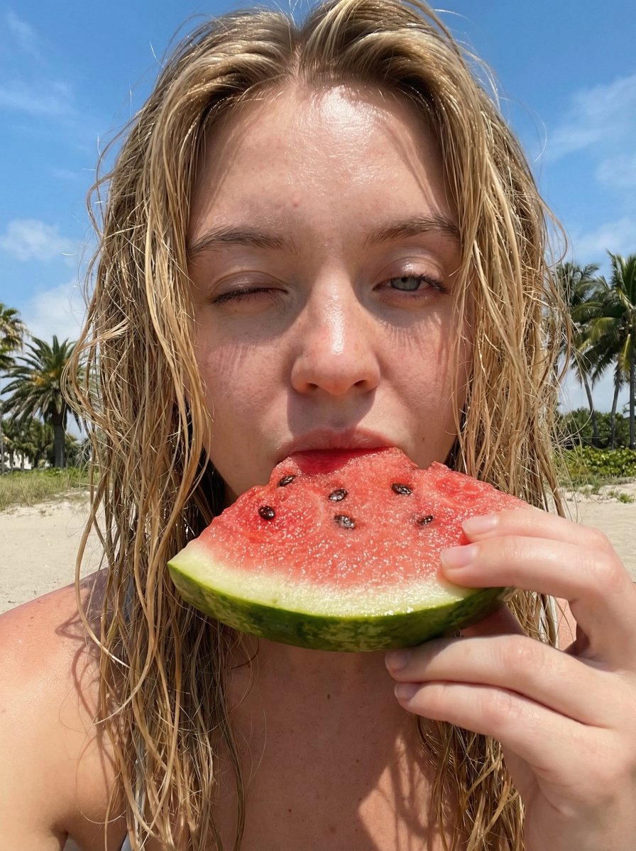 { "photo_type": "outdoor summer selfie, candid lifestyle", "subject": { "count": 1, "use_reference_face": true, "preserve_identity": true, "appearance": "{argument name="subject appearance" default="wet hair, natural skin, minimal makeup"}" }, "pose": { "description": "holding a slice of watermelon close to mouth, lips touching fruit, one eye slightly closed", "expression": "playful, relaxed, sun-kissed mood" }, "camera": { "device": "front camera smartphone selfie", "perspective": "handheld close-up", "angle": "slightly low and very close to face", "tilt": "subtle upward tilt", "distance": "arm-length, tight framing", "framing": "face fills most of frame, hand and watermelon in foreground", "lens": "wide smartphone lens (24-28mm equivalent)", "focus": "sharp on face and fruit" }, "composition": { "subject_position": "center", "foreground": "hand holding watermelon partially blocking lower face", "background": "palm trees, sky, beach blur" }, "lighting": { "type": "direct harsh sunlight", "direction": "from above and slightly behind", "effect": [ "strong highlights on forehead, nose, cheeks", "deep natural shadows under chin and hair", "sun glow around hair edges", "slight overexposure on highlights" ] }, "color_grading": { "style": "warm summer tones", "temperature": "slightly warm", "contrast": "medium-high", "saturation": "natural with boosted reds and greens" }, "details": { "skin_texture": "real, slightly glossy from sunlight", "hair": "wet strands, natural messiness", "finish": "raw iPhone look, no heavy editing" }, "rules": { "lock_camera_angle": true, "avoid": [ "studio lighting", "perfect symmetry", "over-smooth skin", "wide distance shots" ] } }Related Nano Banana Pro Prompts