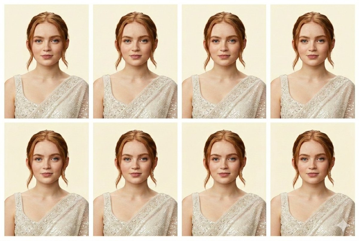Nano Banana Pro AI image example generated with this reusable CDance AI prompt: A structured JSON prompt designed to generate a grid of six identical, ultra-realistic passport-size photos based on an uploaded image,…