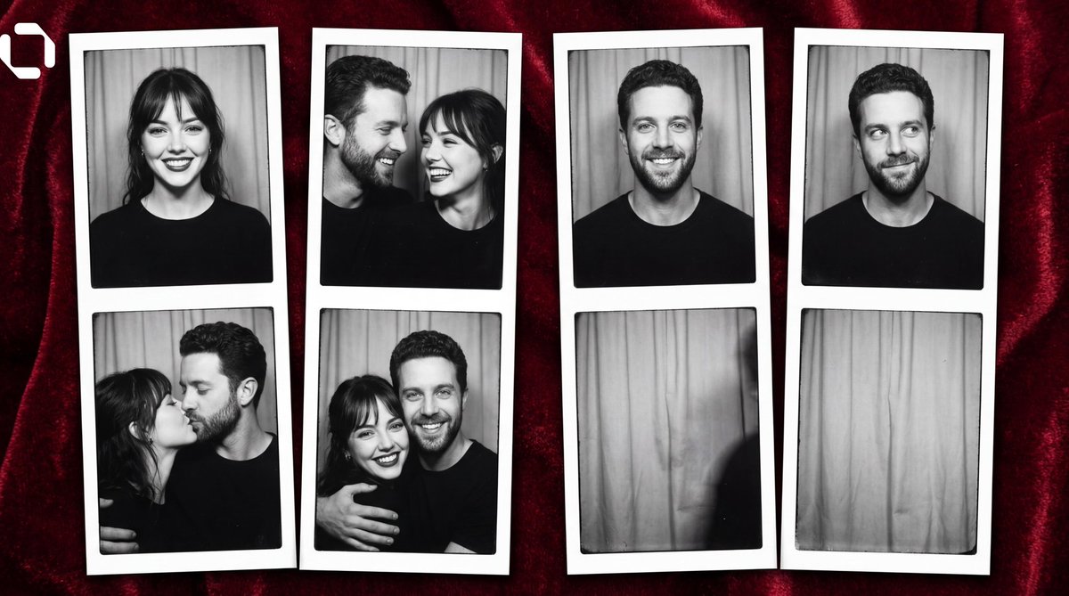 CRITICAL: Preserve both people's facial features exactly as in the reference photos. Both must be clearly recognizable. Create two vertical photo booth strips side by side on a dark red textured fabric background. Each strip has 4 square black-and-white frames stacked vertically with white borders. The story: he gradually leaves HIS strip (right) and appears in HER strip (left). LEFT STRIP: Frame 1: woman ALONE, smiling at camera Frame 2: couple TOGETHER — he has appeared next to her, they look at each other laughing Frame 3: couple kissing, eyes closed Frame 4: couple embracing, both smiling at camera RIGHT STRIP: Frame 1: man ALONE, smiling at camera Frame 2: man ALONE, looking sideways toward her, as if about to leave his frame Frame 3: the frame is almost empty — only a faint shadow or slight blur where he was, he has left Frame 4: empty frame — just the photo booth background, no person, he is gone completely All frames black-and-white, high contrast, slight film grain. Direct front flash, flat photo booth lighting. Both wear simple dark clothing. Tight framing — head and shoulders. Strips are separate, never merging.
