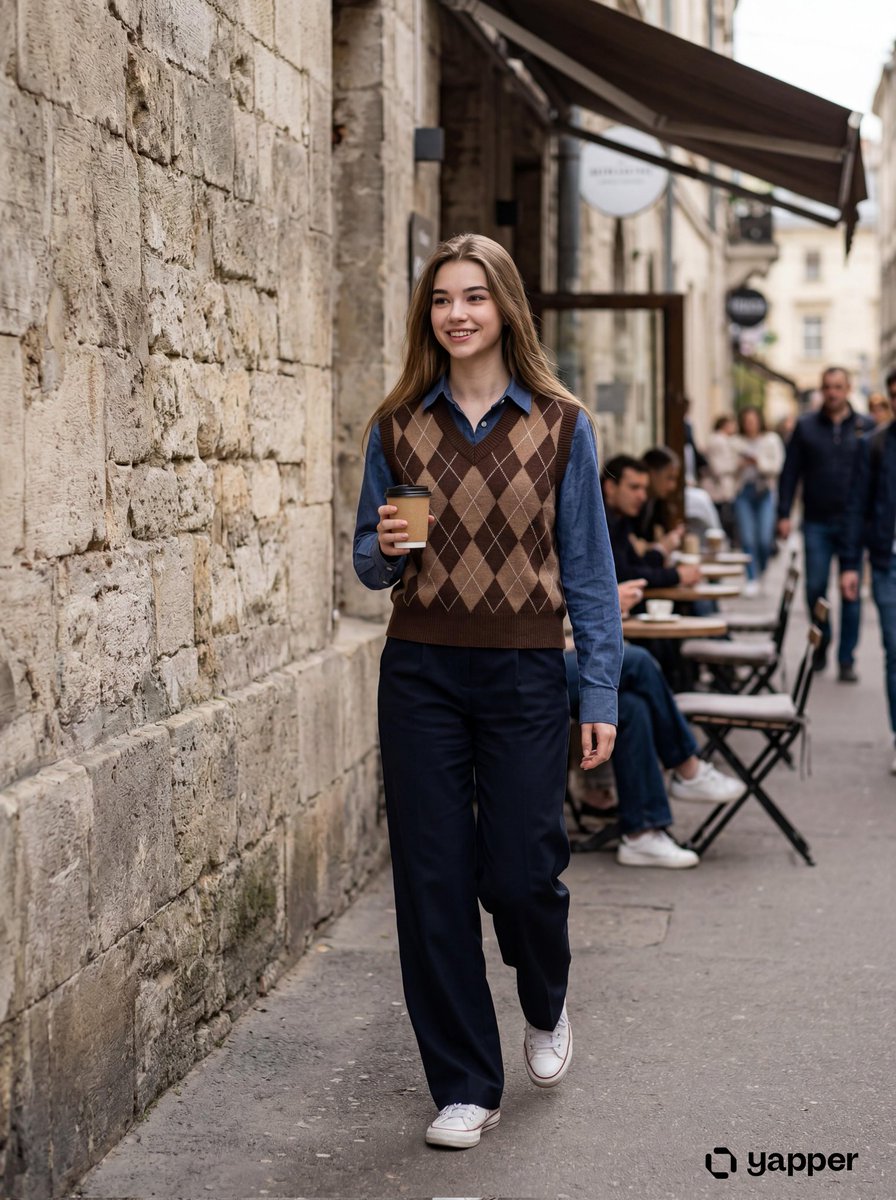 Young woman walking on a street holding a coffee cup, wearing a brown argyle sweater vest over a blue shirt and dark wide-leg pants, casual sneakers, soft natural lighting, aesthetic urban background with stone wall and cafe, candid lifestyle photography, photorealistic