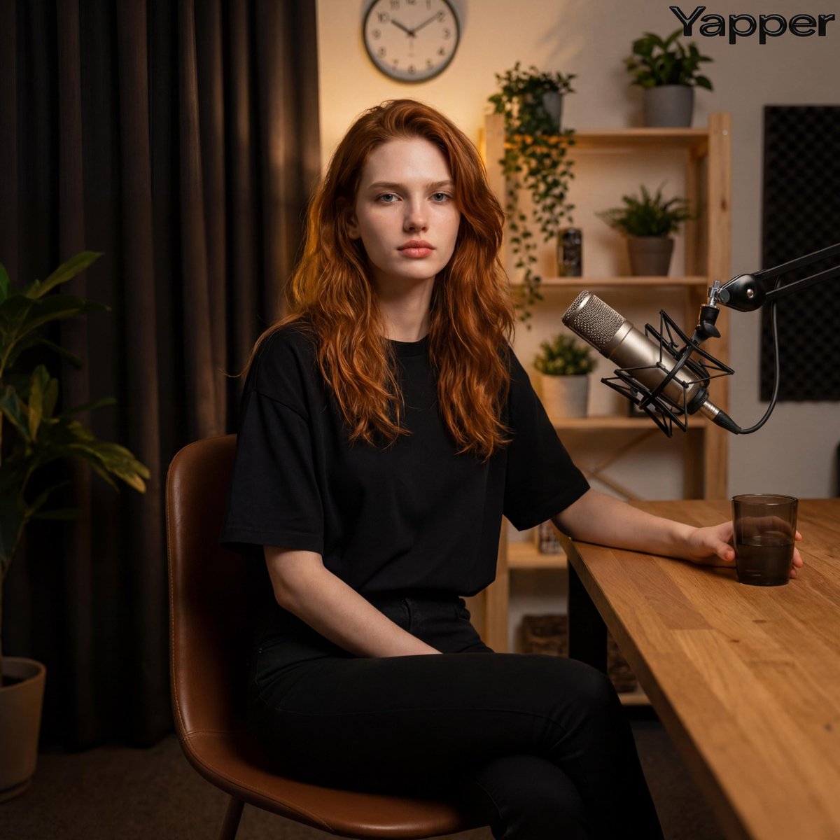 A person seated at a wooden table with long wavy hair (no hat), with an empty hand near a studio microphone. Preserve exact facial identity from the reference. Photorealistic skin texture. Expression: Calm and focused, making direct eye contact with the camera, with a slightly relaxed mouth. Outfit: Black oversized T-shirt and black slim-fit pants. Action: Sitting and leaning slightly forward, one hand resting empty near the studio microphone (no phone), the other resting near a dark glass on the tabletop. Environment: Warm recording studio with dark curtains, wooden shelving with plants, a wall clock, and a wooden table. Lighting: Soft, warm studio lighting with natural shadows and a cozy atmosphere. Art Style: High-resolution photorealism matching the original studio look. Details: Retain original composition, camera angle, studio microphone, chair, and background props.
