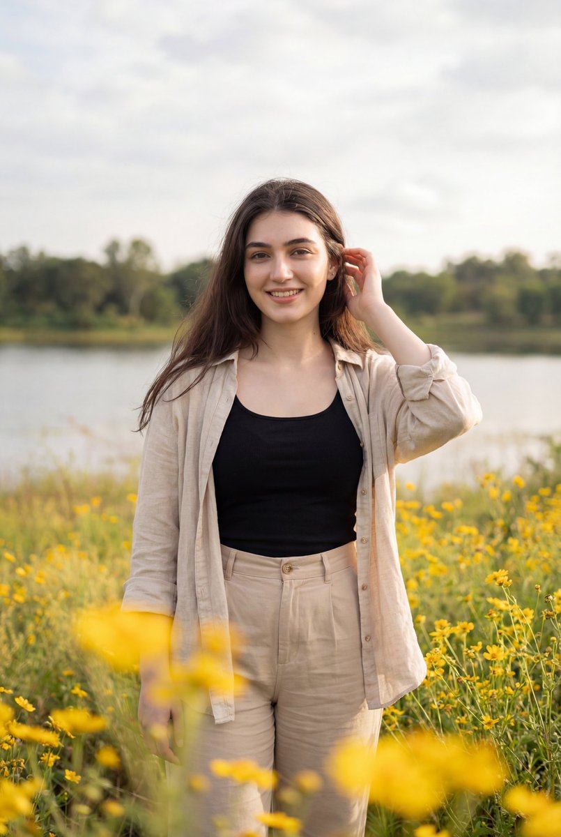 Photorealistic portrait of a smiling young woman standing in a field of yellow wildflowers, wearing a black top, beige high-waisted pants, and a loose beige shirt, long dark brown hair, natural makeup, casual pose with one hand touching her hair, soft natural daylight, shallow depth of field with blurred yellow flowers in the foreground, background featuring a lake and trees under a bright cloudy sky, warm tones, cinematic composition, high detail, 85mm lens, bokeh effect.