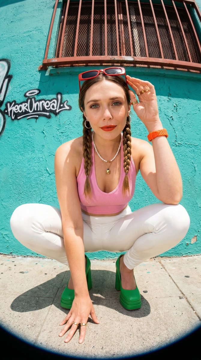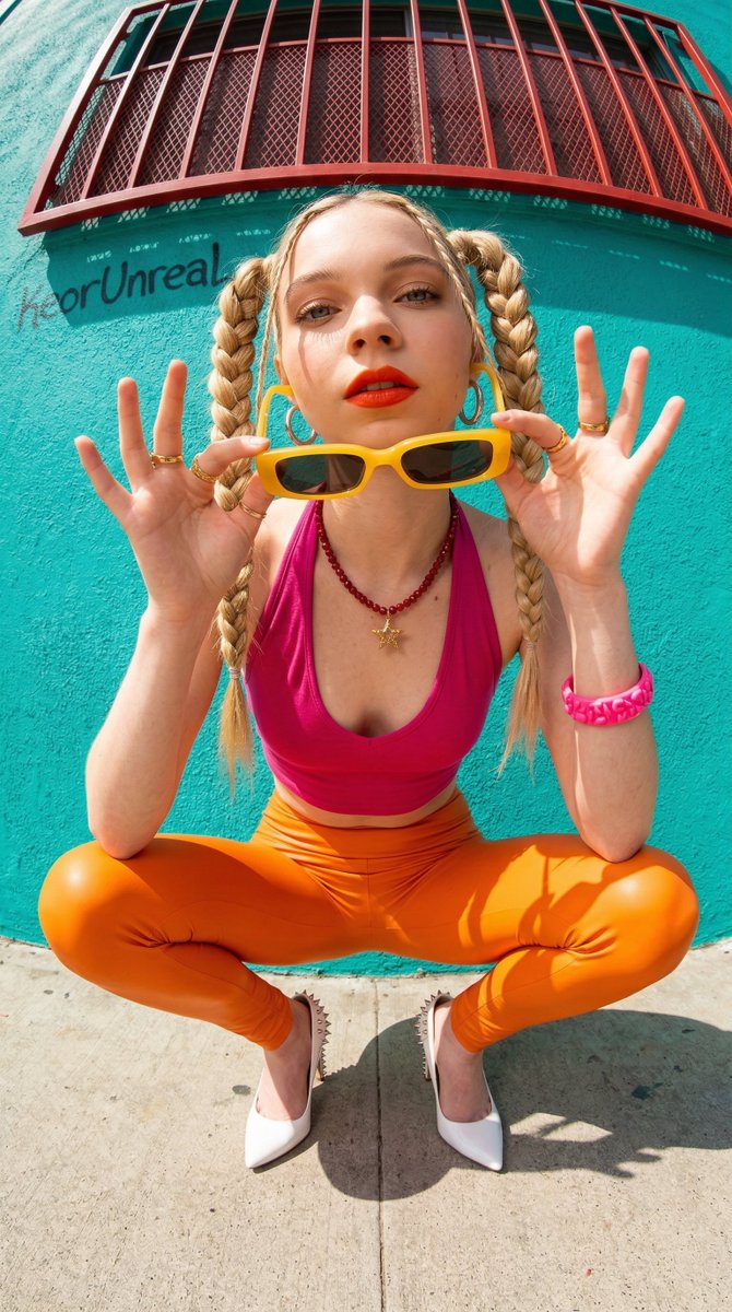 "Generate a highly detailed, photorealistic 8K streetwear fashion portrait of {argument name="subject name" default="Emma Myers"}, who is dominating about 90% of the frame. The shot is taken from a low angle with a close-up perspective, using a wide-angle lens with heavy fisheye distortion to simulate a photo taken on a modern smartphone. She has thick blonde pigtail braids, bright orange-red lips, and a confident expression. She is in a low, crouched squat position on the floor, balancing on the spiked high heels and both hands are placed flat on her thighs, leaning slightly forward, and looking directly at the camera. Yellow-framed rectangular retro sunglasses slightly away from her eyes with both hands. She is wearing a fuchsia cotton halter crop top, tight orange latex leggings, and white high heels. Her accessories include a ruby bead necklace with a gold star pendant, silver hoop earrings, gold rings, and a bright pink bracelet with a raised texture. The outdoor setting features a vibrant, textured teal wall behind her with a graffiti written 'KeorUnreal'and a red metal grate above. The scene is lit by intense, direct daytime sunlight, creating hard shadows and high contrast that highlight the vibrant color palette (orange, white, orange, fuchsia and pink), perfectly capturing a modern, retro-casual summer vibe. Aspect ratio 4:5."Related Nano Banana Pro Prompts