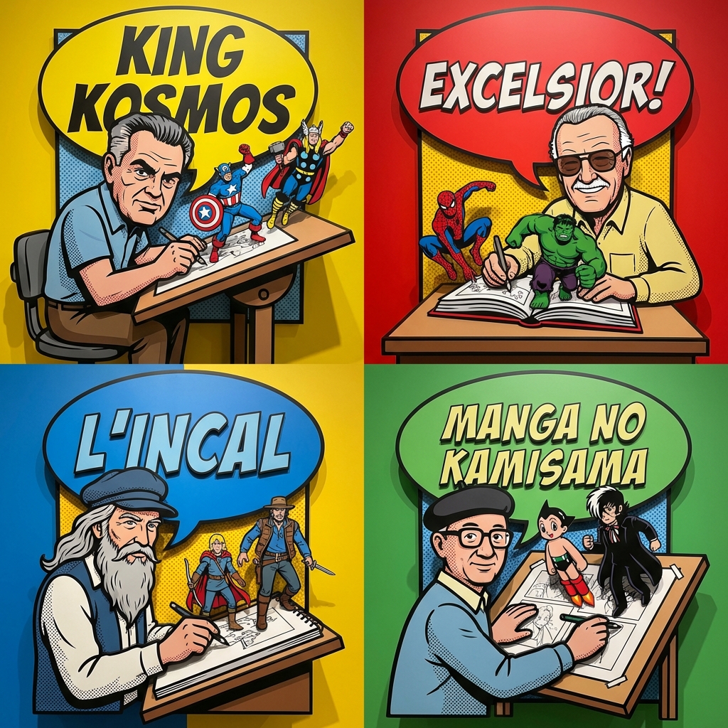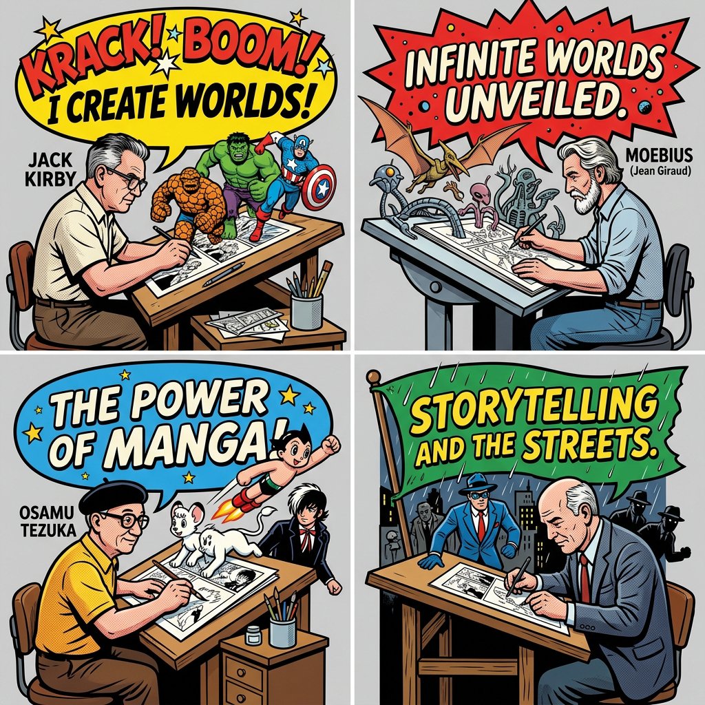 Nano Banana Pro AI image example generated with this reusable CDance AI prompt: A complex, weighted prompt for Nano Banana Pro and Nano Banana 2 to generate a 2x2 grid featuring 3D dioramas of legendary comic artists,…