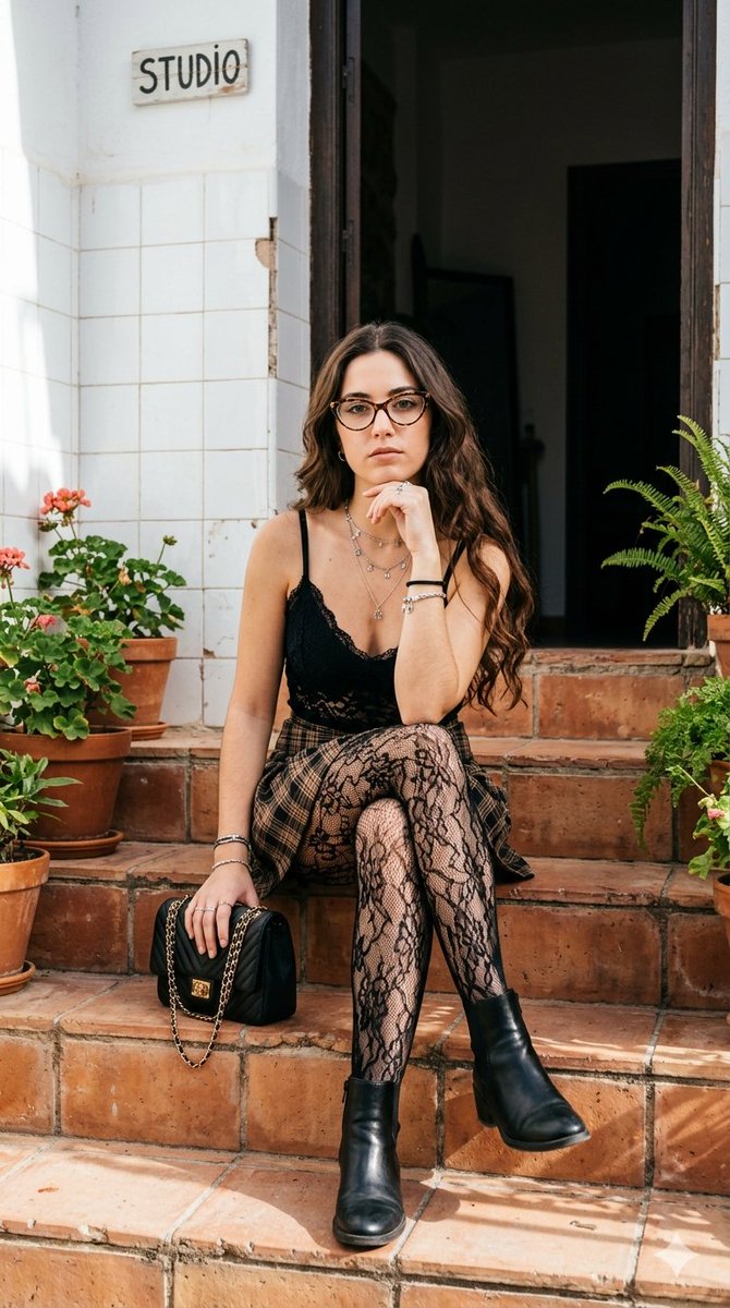 "prompt": "Portrait of a young woman sitting on terracotta steps. Long dark hair, tortoiseshell cat-eye glasses, black lace camisole, brown plaid skirt, black floral lace tights. Layered silver jewelry. Hand resting on chin, serious expression, holding black quilted chain bag. White tiled wall background, dark doorway marked 'STUDIO'. Bright sunlight. 4k ultra quality, 9:16 canvas."