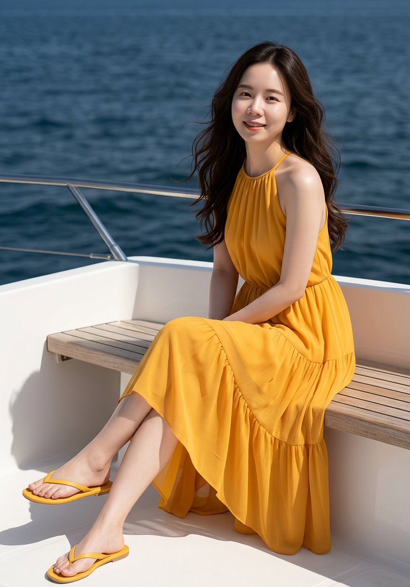 Professional fashion photography, photorealistic 8K, ultra detailed, sharp focus. A medium shot of a beautiful young adult East Asian woman with fair skin and long, dark brown flowing hair with soft waves blowing in the wind. She is sitting on the wooden deck bench on the bow of a yacht. The photo is taken from a **low angle, looking up at her**. Her body is in a **three-quarter view, angled slightly away, while her head is turned to face the camera** with a gentle, pleasant smile and direct eye contact. Her legs are extended forward towards the camera and crossed at the ankles, left leg over right, creating a slight foreshortening effect. She wears a flowing, tiered, {argument name="dress color" default="marigold yellow"} chiffon dress with a halter-neck and a matching ruffled skirt, paired with yellow flip-flops. The scene is lit by **bright, direct daytime sunlight from a high angle on the right, casting distinct hard-edged shadows** on her body and the boat. The background is the deep blue ocean under a clear sky, slightly blurred. Shot on a **{argument name="lens type" default="50mm lens"}**, f/4.0, selective focus. natural pose, no exaggeration, stick to visible elements only.Related Nano Banana Pro Prompts