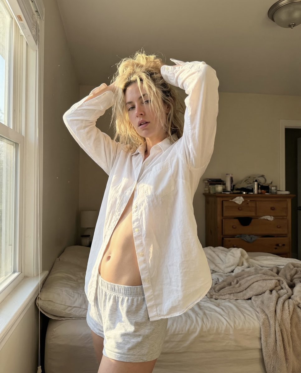 A detailed JSON prompt for Nano Banana Pro to generate an ultra-photorealistic, intimate morning scene captured with an iPhone 17 Pro Max aesthetic. It specifies lighting (direct window light, warm temperature), pose (hands in hair, arched torso), and clothing (oversized white shirt, short sleep shorts), focusing on natural skin sheen and realistic imperfections.
