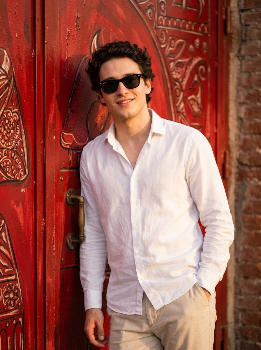 Create a realistic photo of a person using the face from the uploaded image. The person is standing casually in front of a detailed red metal door with artistic patterns. The person is leaning slightly, with one hand in their pocket and a relaxed confident expression. They are wearing a white button-down shirt with the top buttons open, light-colored trousers, and stylish black sunglasses. Warm sunlight falls on the face and body, creating soft shadows and a golden glow. The background is simple but textured with the red door, giving a strong color contrast. The overall look is stylish, clean, and natural. Cinematic lighting, warm tones, realistic shadows, sharp focus, professional photography.