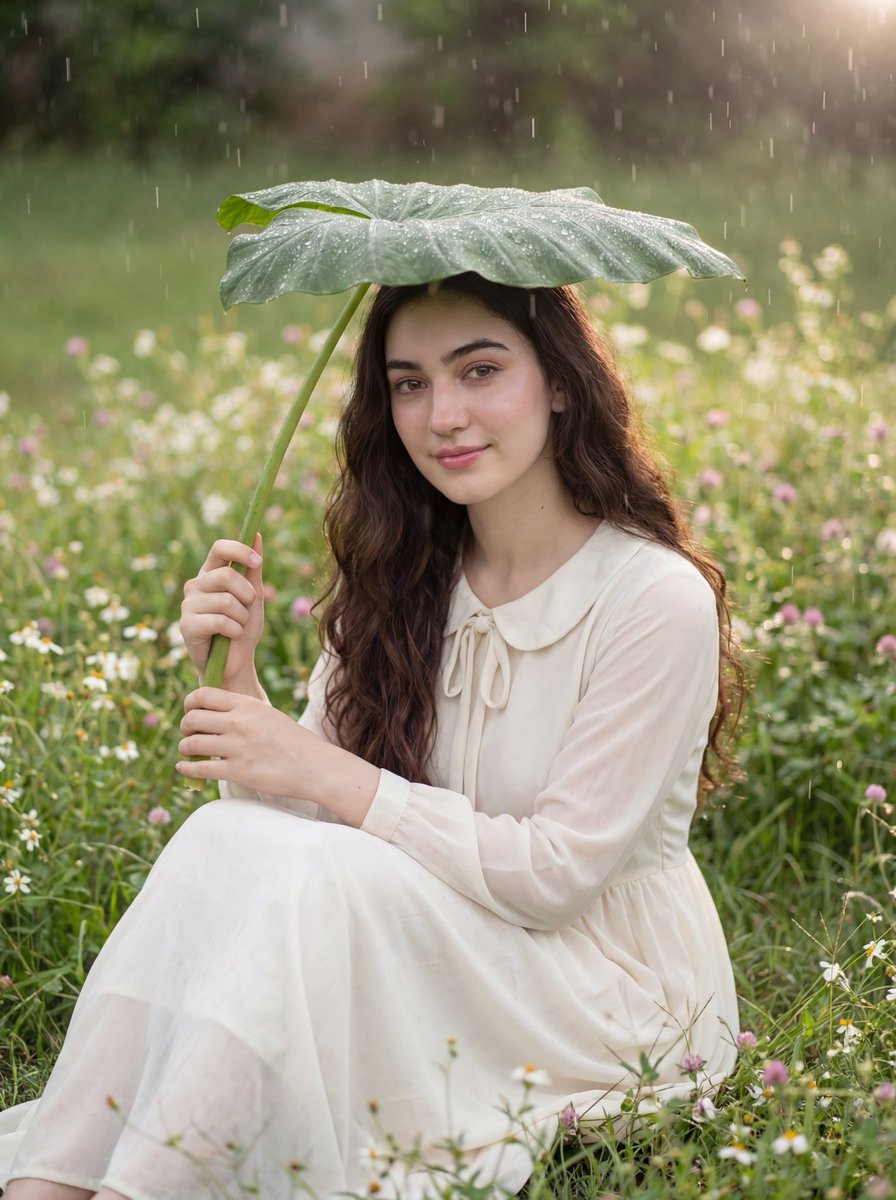 Realistic portrait of a young woman sitting in the middle of a green garden filled with small white and pink flowers as a light rain falls. She has long wavy dark brown hair. She held a soft green large taro leaf as umbrella, with raindrops clearly visible on its surface. She look at camera, smile softly and sparkling eyes. She wore a long ivory white dress (light and flowy material) with a Peter Pan collar detail and a small bow at the neck. Her makeup is soft douyin style makeup (glowing skin, clean matte foundation, soft blended pink blush, subtle highlights on the nose and cheekbones, thin eyeliner , soft pink eyeshadow, natural brow and long manhwa lashes, glossy pink lips. The background is a stretch of green grass with a shallow depth of field, slightly blurred wildflowers, and the effect of slowly falling rain with dreamy vibe. Soft natural lighting, little backlight from the cloudy sky. fresh, clean, and cinematic photorealistic feel.