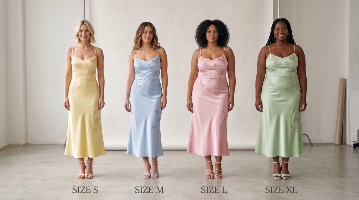 "notes": "Create a highly realistic fashion lineup showing four adult women standing side by side in one professional studio image, photographed from a slightly farther distance so the full silhouettes are clearly visible. This must look like a premium real-world size range campaign, not an AI beauty collage. Use the same satin spaghetti-strap dress design on all four women, but make the garment fit truly realistic for sizes S, M, L, and XL. Each size must have proper grading, different seam behavior, different fabric pull, different waist and bust fit, different hip drape, and different hem fall according to the body. The four dresses are the same design in different soft pastel colorways: pastel yellow, pastel blue, pastel pink, and pastel green. Add refined butterfly embellishments or applique details that feel elegant and fashion-forward, not childish. The women should look like real fashion models in a commercial editorial studio shoot, with natural posture, slight human asymmetry, believable body diversity, realistic skin texture, and subtle expression variation. Add simple clean size labels below each model: S, M, L, XL."