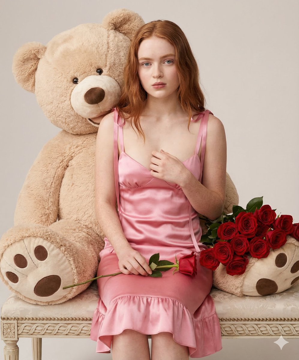 A JSON prompt for generating a high-resolution fashion photograph of a young woman with auburn hair, seated on a bench in a pink satin slip dress, holding a red rose, with an oversized beige teddy bear positioned behind her in a soft, intimate studio setting.