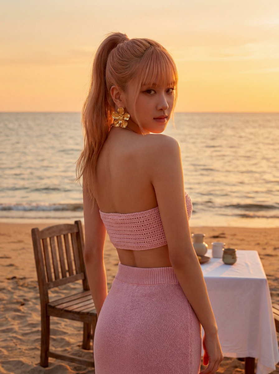 "raw_prompt": "A high-resolution portrait of {argument name=\"subject name\" default=\"Rosé (BLACKPINK)\"} at a beach during sunset. She has long, strawberry blonde hair with blunt bangs, styled in a ponytail. She wears a soft pastel pink crochet two-piece set consisting of a strapless bandeau top and a matching high-waisted skirt. She is adorned with large, gold floral statement earrings. She stands with her back to the camera, looking over her shoulder with a soft, cinematic gaze. The background features a white-clothed table on a sandy beach, a wooden chair, and the ocean under a warm, golden hour sky. Shot on 35mm lens, soft natural lighting, warm color grading. --ar 9:16",
