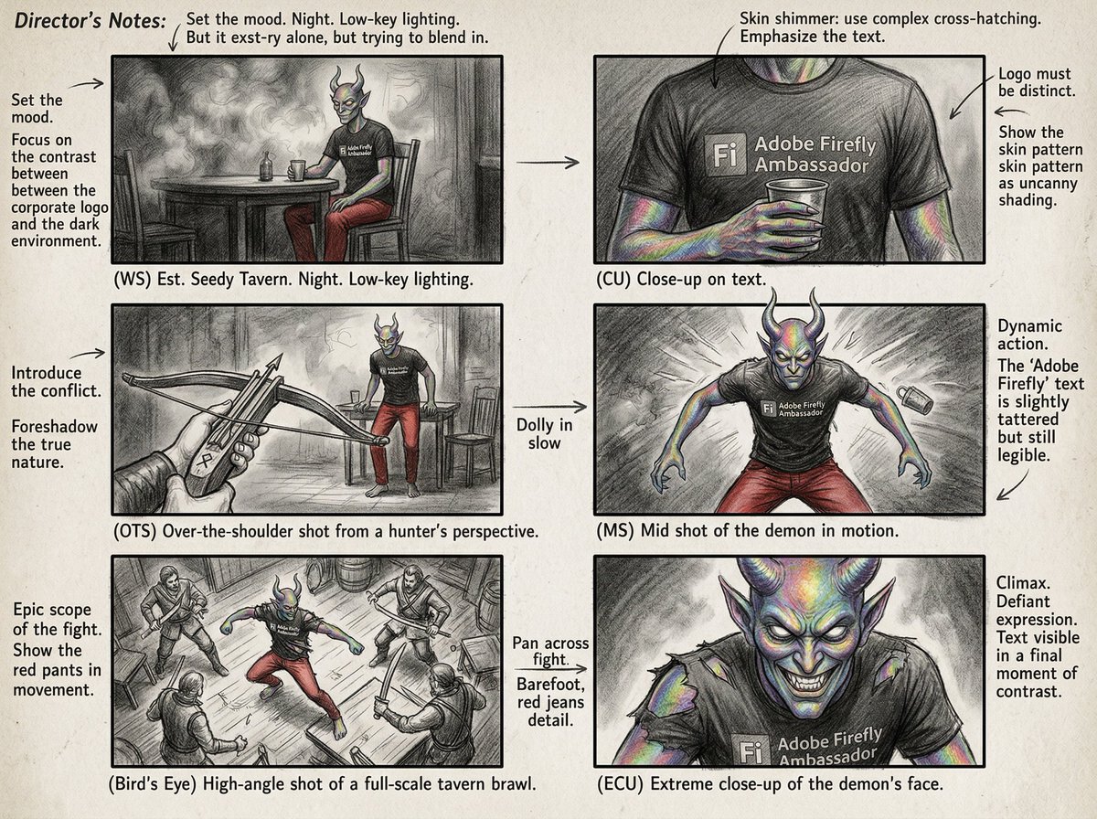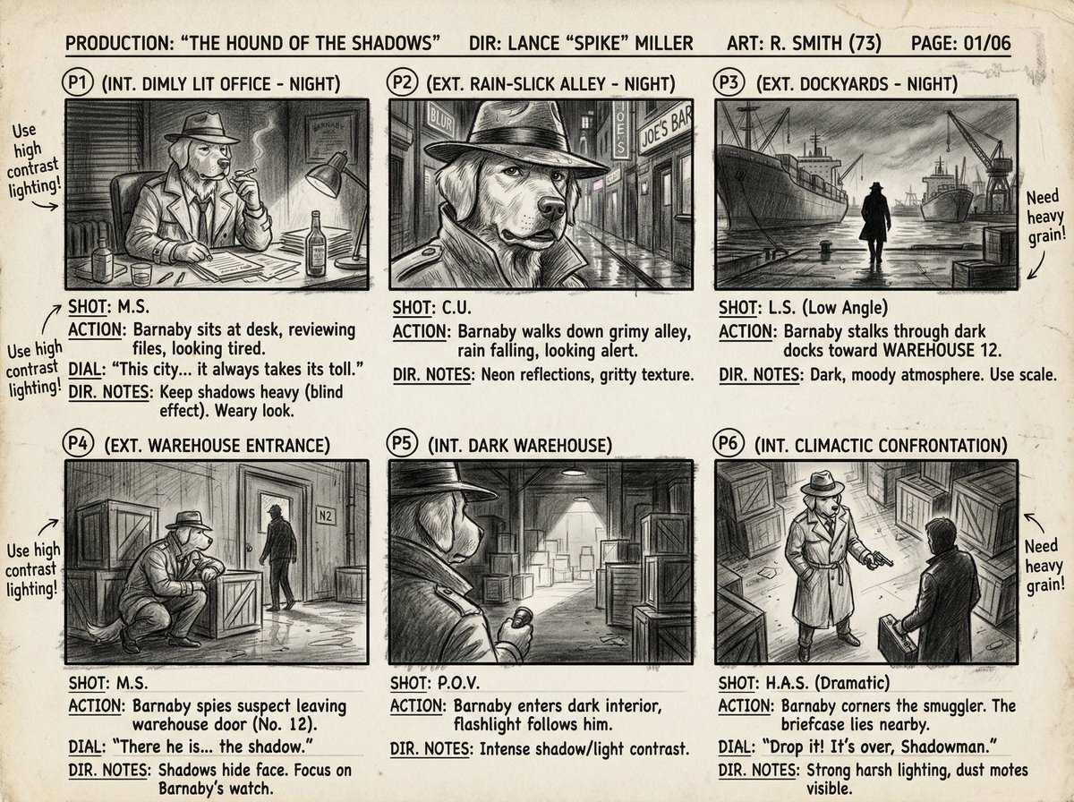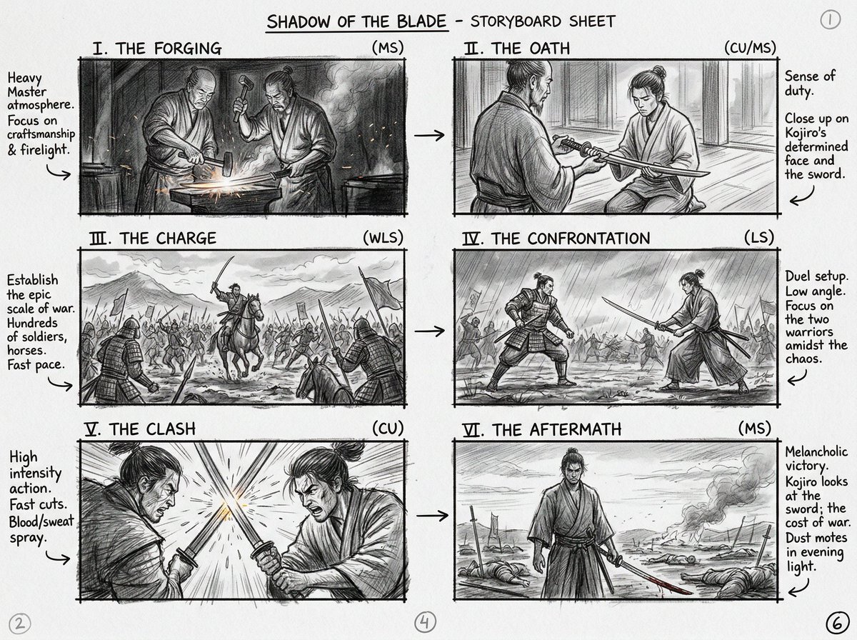 [Image reference/object/person] as a [movie/TV show genre] movie storyboard, six sequential panels, pencil sketch with tonal shading, cinematic camera angles, shot type labels, director's notes in margins, 4K storyboard sheet.