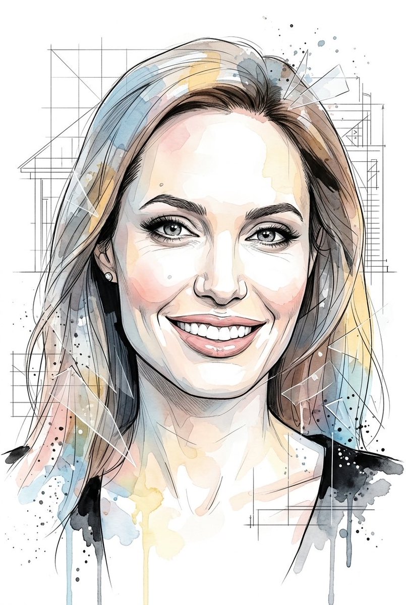 Use the uploaded image as reference, A blend of high-end illustrative realism with delicate ink lines and soft watercolor strokes. Highly detailed depictions of faces with porcelain skin texture, delicate blush, and expressive sparkling eyes. Dynamic compositions of close-up portraits. Crisp white negative space backgrounds overlaid with architectural outlines, geometric construction grids, and technical drawing elements. Flowing strands of hair and fabric edges dissolve into abstract, transparent shards of color and paint splatters. A soft pastel palette (soft blues, warm yellows, pale pinks, light grays) with controlled saturation. An elegant balance between precise sketch lines and loose, atmospheric paint effects. A cinematic editorial illustration aesthetic with a modern fashion art feel, dreamy yet sharp, minimalist yet rich in detail. High-resolution, vertical portrait, 4k quality.