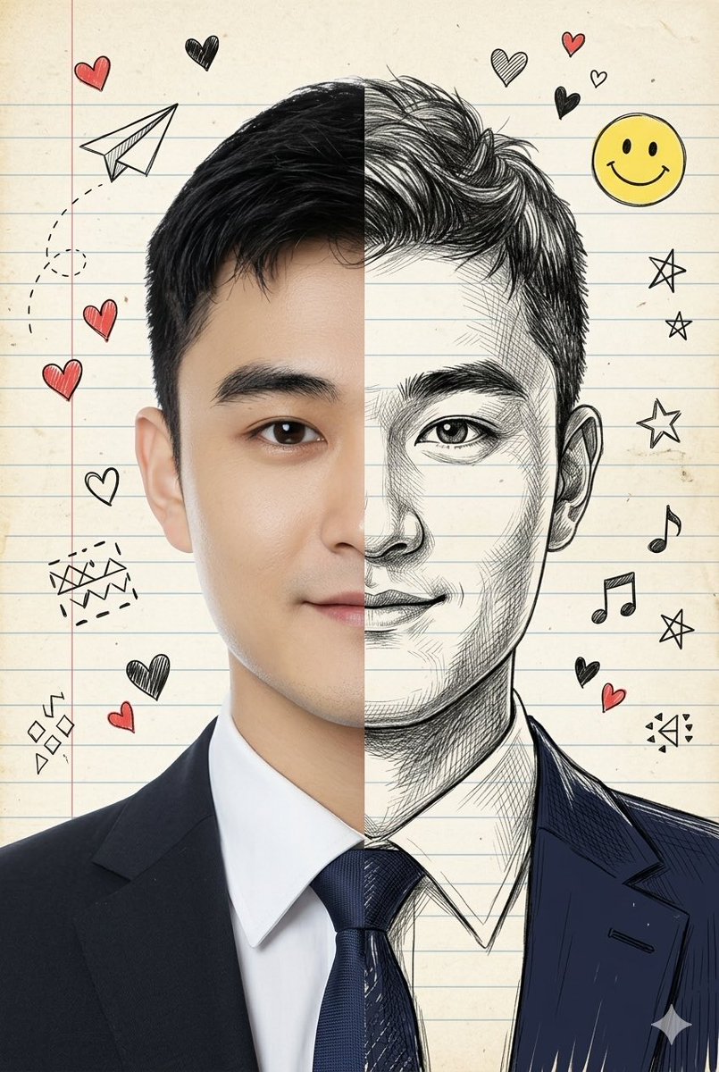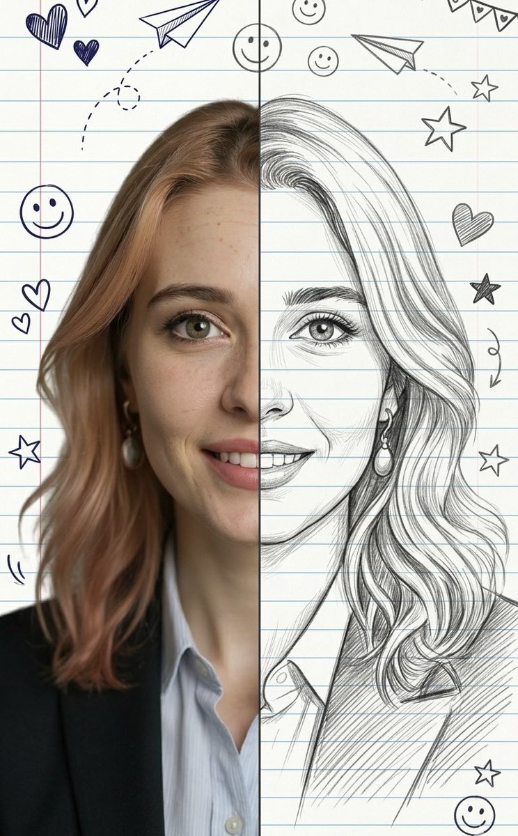 A split-view vertical portrait combining a realistic photograph of a person [ use the uploaded photo as reference] on the left with a hand-drawn illustration of the same person on the right, both set against a lined paper background decorated with doodles. The image features a creative artistic style contrasting photography with line art. The background includes doodles such as hearts, a paper airplane, and a smiley face. Highly detailed, 8k, vertical portrait.