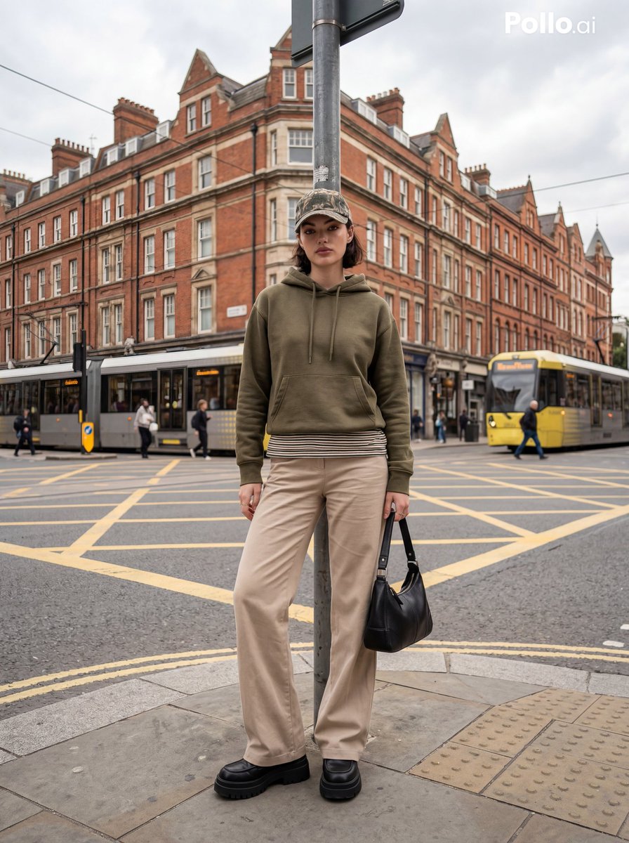 A stylish young woman posing at a city street intersection in a European city, red brick buildings on both sides, standing beside a metal street pole, wearing a camouflage baseball cap, striped shirt, olive green hoodie, beige wide-leg trousers, chunky black platform shoes, holding a black leather handbag, casual street fashion, soft natural daylight, overcast sky, urban aesthetic, yellow road markings, cinematic street photography, full body shot, centered composition, high detail, realistic, fashion editorial style, 35mm lens, shallow depth of field