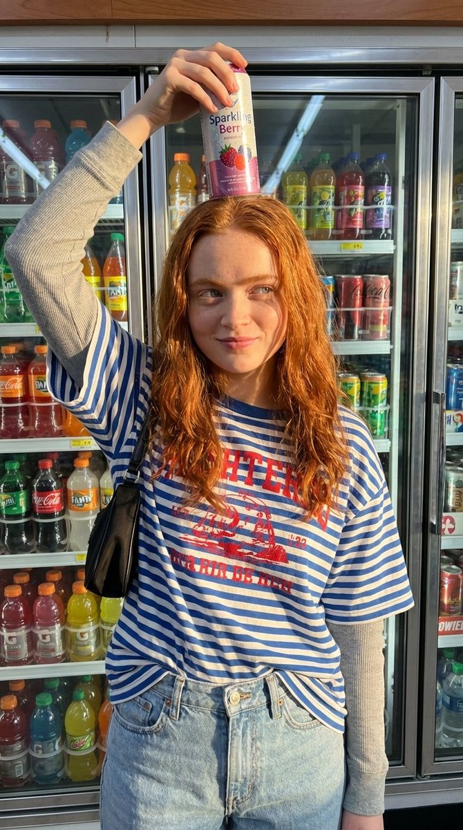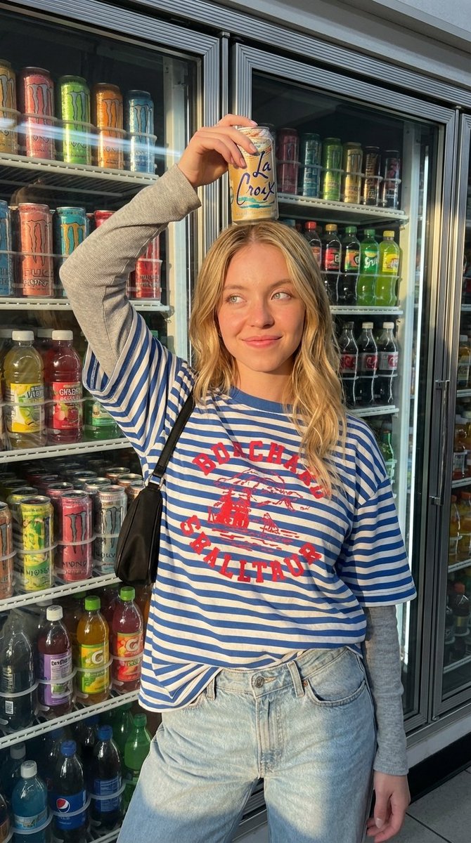 full body photo of a stylish young woman standing in front of a convenience store refrigerator, glass doors filled with colorful drinks and cans, bright sunlight casting strong shadows, warm golden hour lighting, outfit: oversized striped blue and white t-shirt with red graphic print, light wash denim jeans, casual layered long sleeve underneath, small shoulder bag, pose: playful confident pose, one hand raised holding a drink can above head, relaxed expression with slight attitude, looking slightly to the side, environment: convenience store fridge background, vibrant colors from drinks, urban casual vibe, lighting: natural sunlight hitting from side, strong highlights and shadows, warm tones, camera: candid iPhone photography style, slightly raw, realistic skin texture, sharp focus, style: street fashion, editorial casual, no text, no watermark, no logo --ar 2:3 --style raw --v 7 --stylize 100