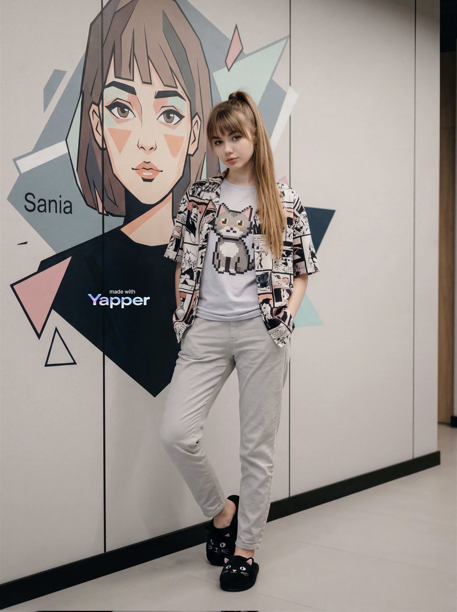 "description": "stylish young woman standing casually beside a modern illustrated wall mural",