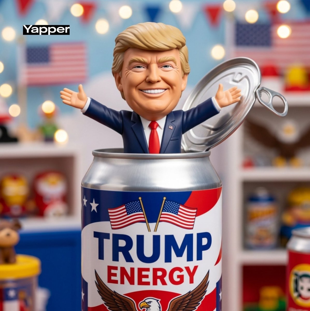 A stylized football figurine or character using uploaded image popping out of a giant opened energy drink can designed with team colors, arms wide in celebration. The can lid is bent open beside the character. Bright studio lighting, playful collectible toy style.