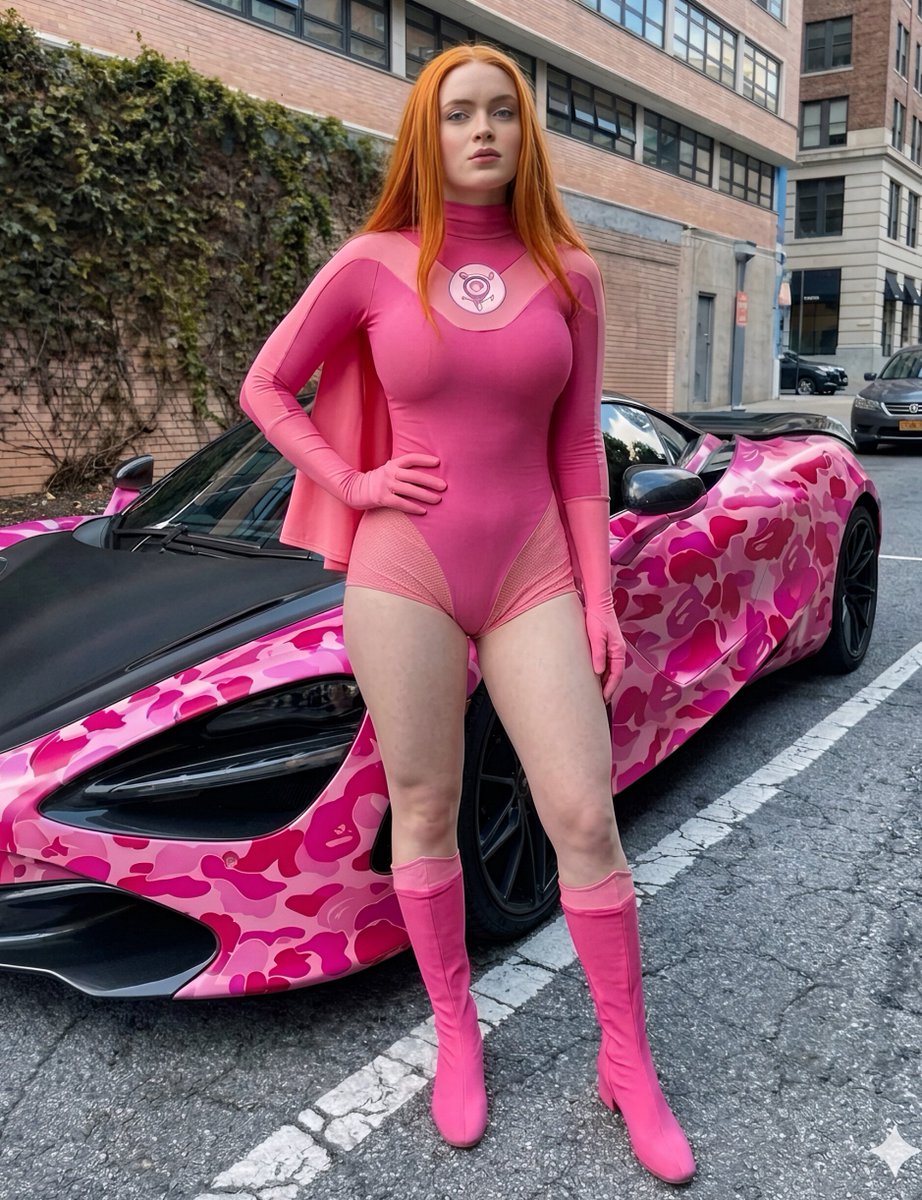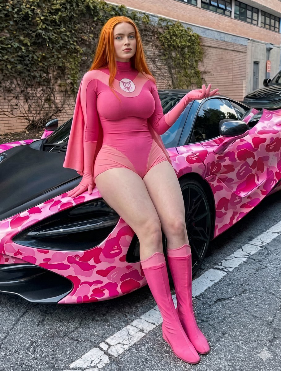 First image prompt: A realistic full body photograph of a beautiful young woman with long straight vibrant orange hair, fair skin, and striking blue eyes, standing confidently in an urban street setting during daylight. She has a slender yet curvaceous athletic build with long legs. She is wearing a form-fitting bright pink superhero-style bodysuit with long sleeves, a high neck, and a short attached pink cape flowing behind her. The bodysuit features a circular white and pink emblem on the chest, mesh texture panels on the lower torso, and matching bright pink knee-high boots. Her left hand rests on her hip while her right arm hangs naturally by her side. She stands next to a sleek modern sports car completely wrapped in a vibrant pink and magenta camouflage pattern with black accents, positioned on an asphalt road with white painted lines. In the background there is a multi-story brick building with large windows, some greenery on the wall, and a few parked vehicles further down the street. The lighting is natural daylight with soft shadows, creating a cinematic and vibrant atmosphere. High detail, photorealistic, sharp focus, 8k resolution. Second image prompt: A realistic full body photograph of the same beautiful young woman with long straight vibrant orange hair, fair skin, and striking blue eyes, posing elegantly while sitting on the hood of a sleek modern sports car. She has a slender yet curvaceous athletic build with long legs. She is wearing the same form-fitting bright pink superhero-style bodysuit with long sleeves, a high neck, and a short attached pink cape draped over her shoulders. The bodysuit has a circular white and pink emblem on the chest and matching bright pink knee-high boots. Her left hand is placed on the car hood for support while her right hand is raised with an open palm gesture near her shoulder. She looks directly at the camera with a neutral expression. The sports car is wrapped in a vibrant pink and magenta camouflage pattern with black accents and is parked on an asphalt street with white lines. The background shows a brick building with windows and greenery on the wall under natural daylight conditions. The overall scene has a cinematic, vibrant, and high-fashion feel. High detail, photorealistic, sharp focus, 8k resolution.