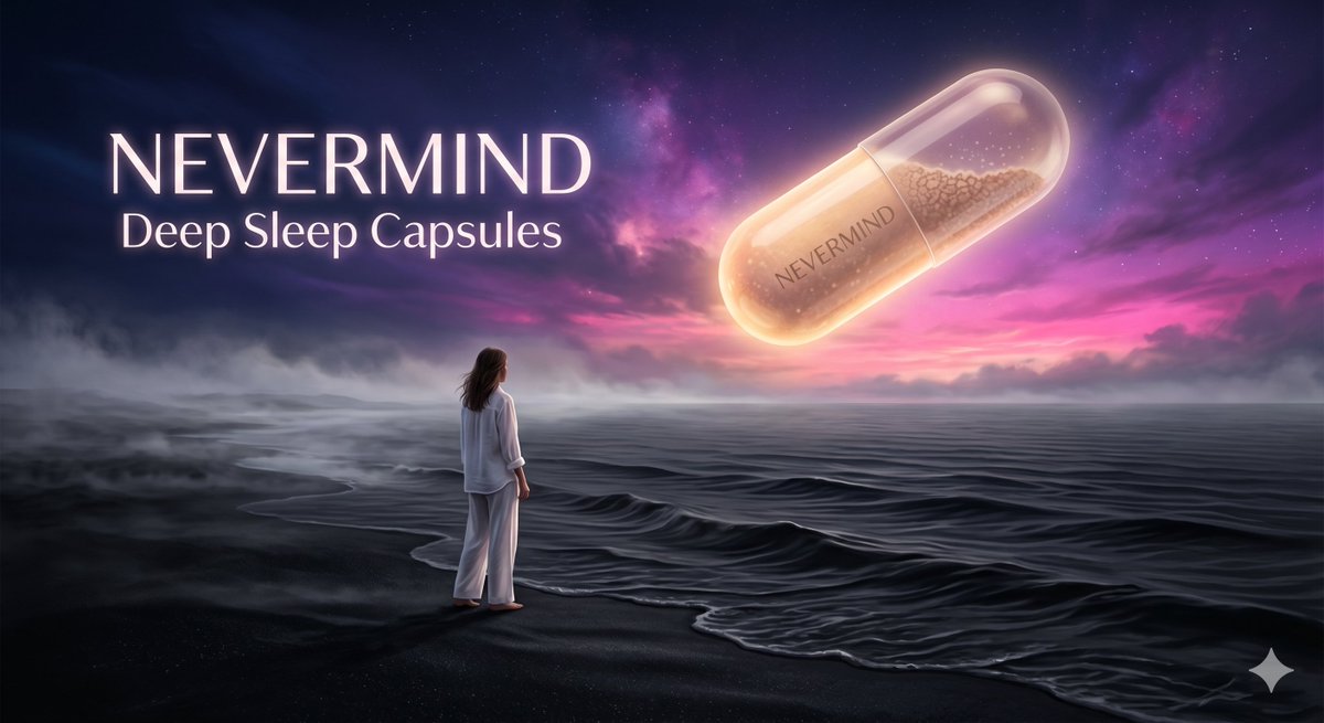 A highly stylized, surreal absurdist digital painting advertisement featuring the elegant, modern typography "{argument name="product name" default="NEVERMIND Deep Sleep Capsules"}". A solitary human figure wearing {argument name="clothing" default="flowing white linen pajamas"} stands at the edge of an endless, perfectly flat ocean made entirely of matte black sand that realistically ripples and waves like liquid water. Low-lying atmospheric ground fog rolls across the dark shoreline. The sky above is a {argument name="sky color" default="surreal gradient transitioning from deep midnight indigo to luminescent violet and vibrant neon rose"}. Dominating the background, floating at an impossibly colossal scale like a celestial moon, is a giant translucent pharmaceutical capsule pill emitting a warm, ethereal amber bioluminescent glow. Deadpan, extreme wide-shot composition emphasizing vastness, isolation, and spatial paradox. High contrast chiaroscuro low-key lighting, dreamscape aesthetic, deeply metaphorical, hyper-detailed, 8K resolution, sharply cinematic masterpiece.Related Nano Banana Pro Prompts