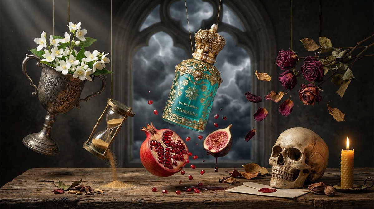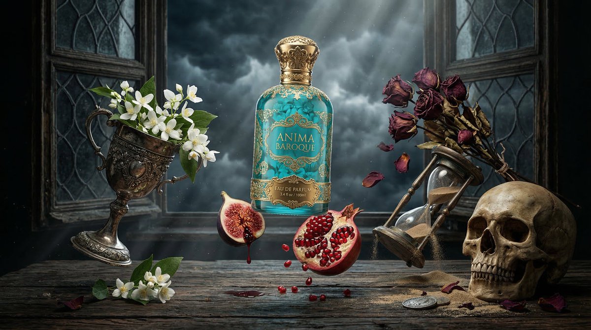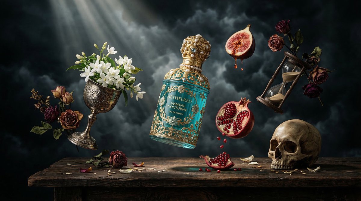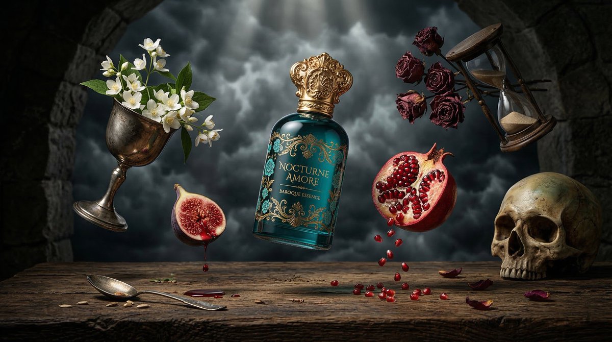 Surreal baroque luxury perfume ad: {argument name="bottle description" default="turquoise floral bottle with ornate gold cap"} floating above rustic wooden table, surrounded by suspended symbolic objects – silver chalice overflowing white jasmine, halved fig dripping juice, split pomegranate seeds falling, dried roses, tipped antique hourglass, realistic human skull, dark stormy cloud background, moody Dutch golden age lighting, hyper-real textures, cinematic shadows, volumetric god rays, editorial 8K product photographyRelated Nano Banana Pro Prompts