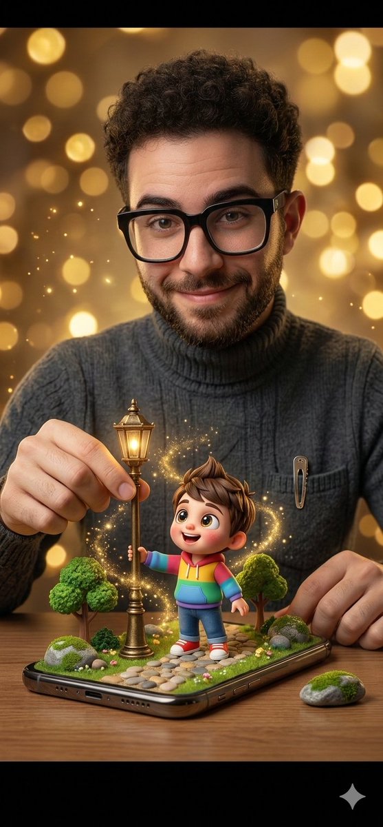 "raw_prompt_text": "A surreal cinematic 8K hyper-realistic scene of a stylish young man emerging from a glowing smartphone screen placed on a wooden table. He smiles mischievously while holding a tiny adorable 3D cartoon boy by his hair tuft like a miniature toy. The tiny boy has oversized sparkling eyes, a joyful expression, tiny sneakers, and a colorful hoodie, swinging in the air with arms open. Reality blends with animation — glowing particles float around them, golden magical dust trails follow the tiny character, and parts of the cartoon world spill out of the phone screen. The man holds a tiny metallic hair clip between his fingers as if he just removed it. Ultra realistic skin texture, highly detailed hands, dramatic cinematic lighting, warm golden bokeh background, shallow depth of field, volumetric lighting, fantasy realism mixed with Pixar-style 3D character, professional photography, 35mm lens, octane render, unreal engine lighting, HDR, hyper-detail, sharp focus, trending on ArtStation, masterpiece, ultra detailed, 8K --ar 9:16 --styRelated Nano Banana Pro Prompts