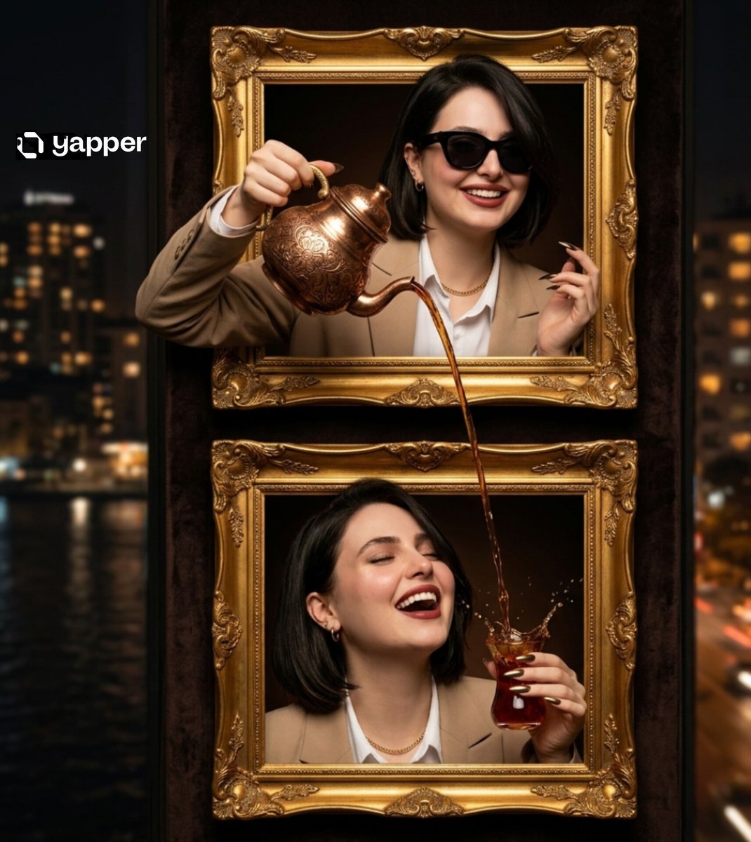 Ultra-realistic cinematic two-frame composition. In the top golden vintage frame, an elegant stylish woman wearing a {argument name="clothing color" default="beige"} blazer, white shirt, and black sunglasses smiles while pouring tea from an ornate engraved copper teapot outward from the frame. The tea flows smoothly out of the frame into the lower frame. In the bottom golden frame, the same woman tilts her head back slightly with a joyful expression, holding a traditional Turkish tea glass as the tea splashes dramatically into it mid-air. Nighttime city skyline with warm glowing lights and water reflections in the background, shallow depth of field, dramatic lighting, high detail, surreal perspective illusion where the liquid connects both frames, cinematic photography, ultra realistic, 8k.Related Nano Banana Pro Prompts