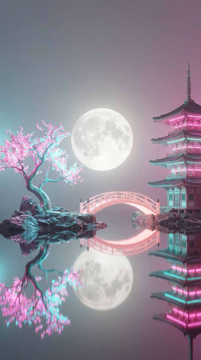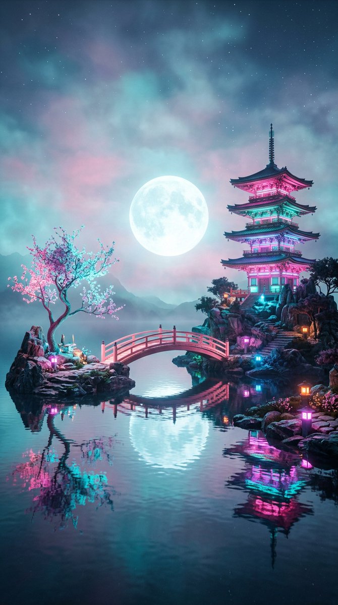 A surreal, ethereal landscape at night featuring a serene body of water reflecting a large, luminous full moon in the center of a misty, soft-toned sky. On the left, a {argument name="plant" default="delicate tree with glowing pink and cyan blossoms"} stands on a rocky islet. On the right, an {argument name="building" default="ornate, multi-tiered traditional Japanese pagoda"} glows with vibrant pink and teal neon light, perched atop a rocky formation. A graceful, arched bridge connects the two islets, also glowing with a soft pink light. The entire scene is bathed in a {argument name="style" default="dreamy, vaporwave-inspired color palette of soft pinks, cyans, and hazy grays"}, with a gentle, magical atmosphere, high-detail 3D render, cinematic lighting, and a calm, tranquil aesthetic.Related Nano Banana Pro Prompts