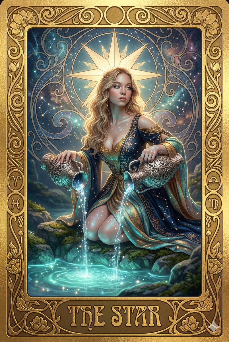 A mystical tarot card featuring a photorealistic {argument name="celebrity name" default="Sydney Sweeney"} as 'The Star' Arcana. She is kneeling gracefully beside a bioluminescent, glowing pool, pouring shimmering celestial water infused with stardust from two ornate, filigreed silver amphorae. The artistic style is a breathtaking fusion of high-fashion photography and intricate Art Nouveau illustration, reminiscent of Alphonse Mucha.