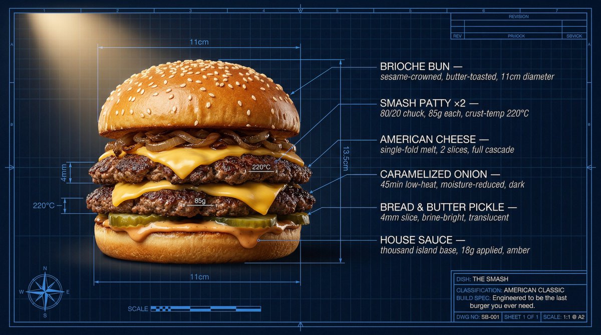 Technical architectural blueprint of a Classic Smash Burger on deep navy drafting paper. Hyperrealistic food hero centered-left, dramatically lit from upper left, warm studio spotlight, cross-section view revealing every layer in precise stack order, lacy-edged patties visible in full photorealistic color, cheese mid-cascade, bun toasted golden, sauce pooling at base catching warm light. Blueprint linework in electric blue, precise measurement lines, stack height callouts, patty thickness cross-section, bun diameter diagram, sauce trajectory arc, grid overlay. Labels connected by thin glowing CAD elbow-joint lines, no crossovers: "{argument name="label 1" default="BRIOCHE BUN sesame-crowned, butter-toasted, 11cm diameter"}" "{argument name="label 2" default="SMASH PATTY ×2 80/20 chuck, 85g each, crust-temp 220°C"}" "{argument name="label 3" default="AMERICAN CHEESE single-fold melt, 2 slices, full cascade}" "CARAMELIZED ONION 45min low-heat, moisture-reduced, dark" "BREAD & BUTTER PICKLE 4mm slice, brine-bright, translucent" "HOUSE SAUCE thousand island base, 18g applied, amber". Labels clustered right and top, white Helvetica Neue Light uppercase, thin italic descriptors below. Compass rose bottom-left, scale bar bottom-center, revision block top-right. Title block double-border bottom-right: "DISH: THE SMASH // CLASSIFICATION: AMERICAN CLASSIC // BUILD SPEC: Engineered to be the last burger you ever need." 4K, tack sharp, electric blue linework glowing softly, warm golden burger tones popping against cool navy. Craveable.Related Nano Banana Pro Prompts