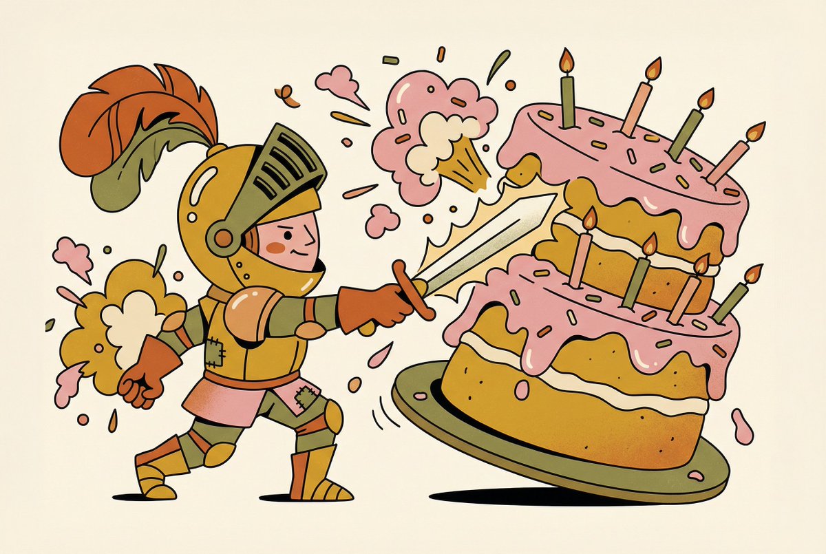 A whimsical and humorous prompt for Nano Banana Pro, generating an illustration of a tiny, fierce medieval knight aggressively battling a towering pink birthday cake with a sword. The prompt specifies an ironic juxtaposition, a whimsical trendy illustration style, and retro 70s graphic design influences.