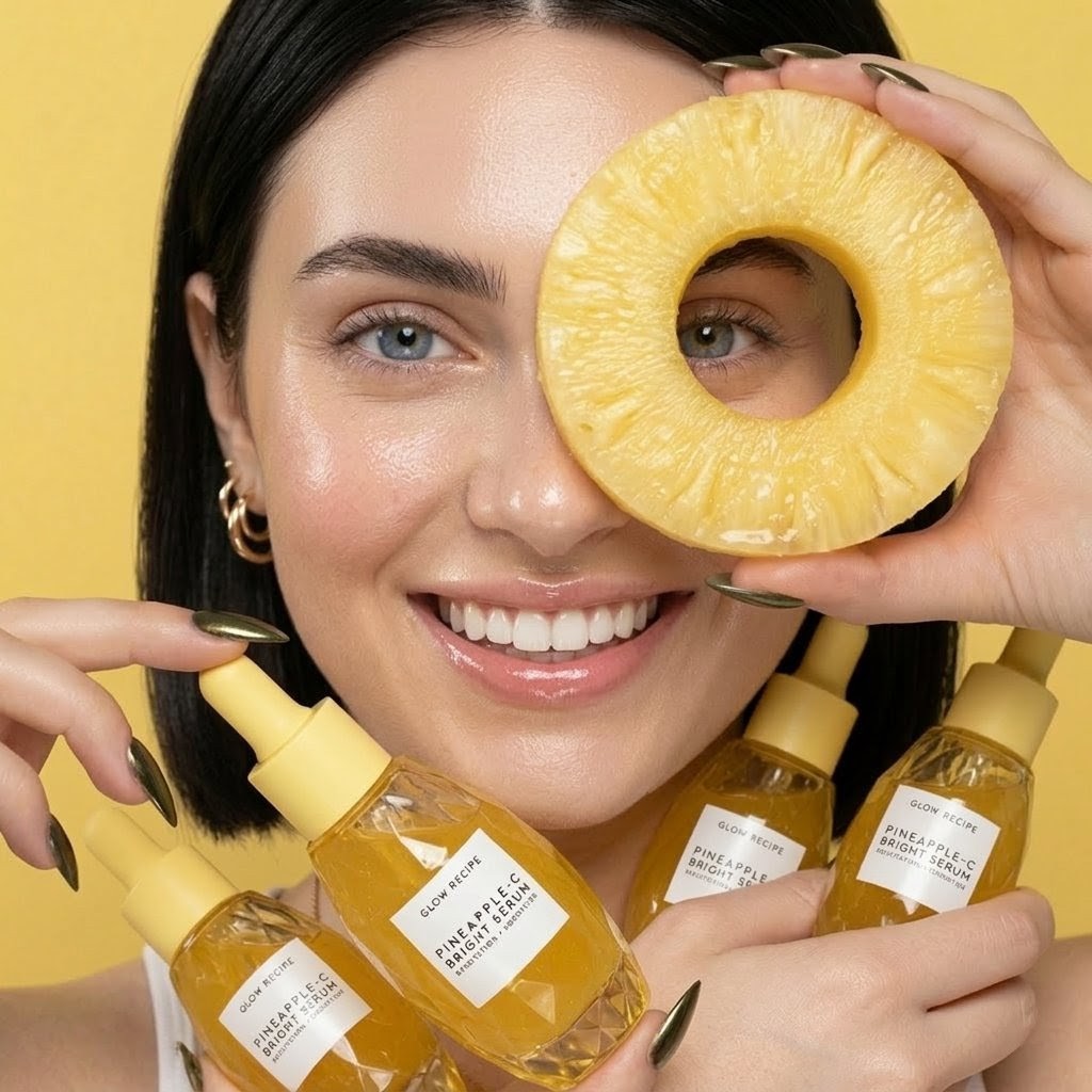 A prompt for ultra-realistic beauty product photography featuring a woman with glowing skin holding a fresh pineapple slice over her eye. It focuses on tropical skincare aesthetic, macro detail, vibrant citrus tones, and high-end cosmetic advertising style.