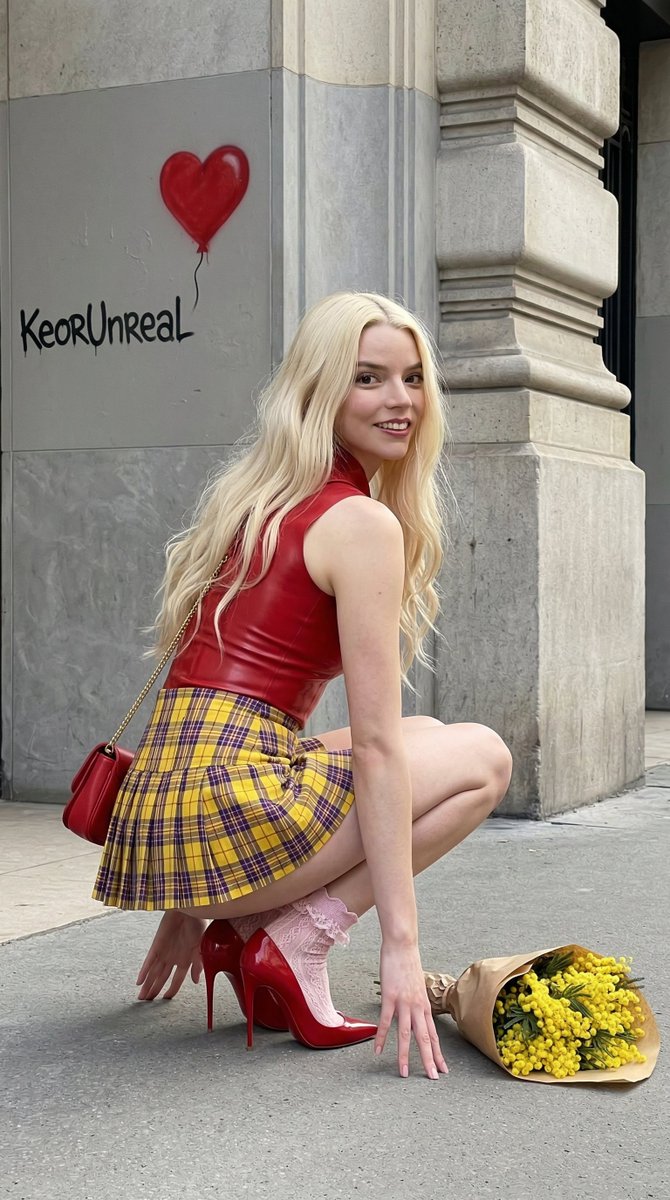 “description”: “Sleeveless latex red shirt and An extremely short yellow and purple plaid pleated ultra-mini skirt, high-waisted and bold. Sheer pink frilly lace socks paired with red high heels stiletto. A small red leather crossbody bag with a gold chain.”,