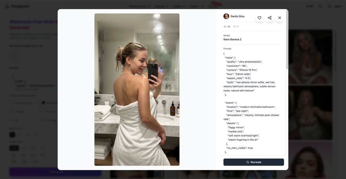 "meta": { "quality": "ultra photorealistic", "resolution": "8k", "camera": "iPhone 15 Pro", "lens": "24mm wide", "aspect_ratio": "4:3", "style": "raw iphone mirror selfie, wet hair, steamy bathroom atmosphere, subtle sensor noise, natural skin texture" }, "scene": { "location": "modern minimalist bathroom", "time": "late night", "atmosphere": "steamy, intimate post-shower vibe", "details": [ "foggy mirror", "marble sink", "soft warm overhead light", "steam lingering in the air" ], "no_men_visible": true }, "subject": { "gender": "female", "age": "mid 20s (clearly adult)", "ethnicity": "{argument name="ethnicity" default="slavic blonde"}", "beauty_level": "instagram model", "outfit": { "top": { "type": "large white bath towel", "fit": "wrapped loosely around chest" }, "bottom": { "type": "bath towel wrap", "color": "white", "fit": "slightly loose, covering one side while the other side reveals part of the hip" }, "accessory": { "type": "small silver necklace", "material": "silver" } }, "pose": { "action": "mirror selfie", "orientation": "back facing mirror", "hips": "turned slightly sideways", "pose_detail": "one hand holding the towel while the other holds the phone, towel covering one side of the hips while the other side is partially visible", "expression": "playful teasing glance over shoulder" } }, "lighting": { "type": "soft warm bathroom lighting", "effect": "gentle highlights on damp skin and wet hair" }, "photography_rules": { "suggestive_not_explicit": true, "iphone_only_look": true, "realism": "very high" } }Related Nano Banana Pro Prompts