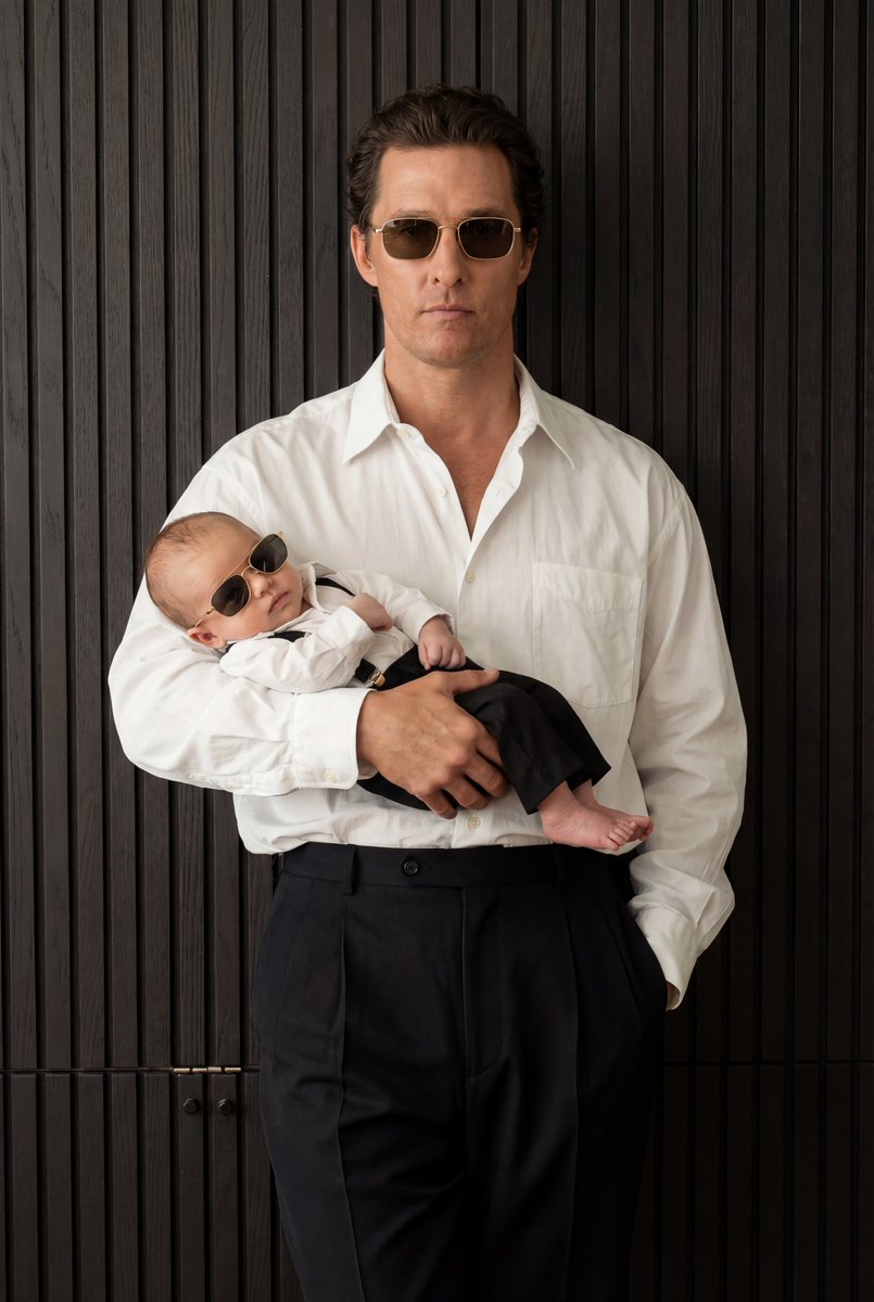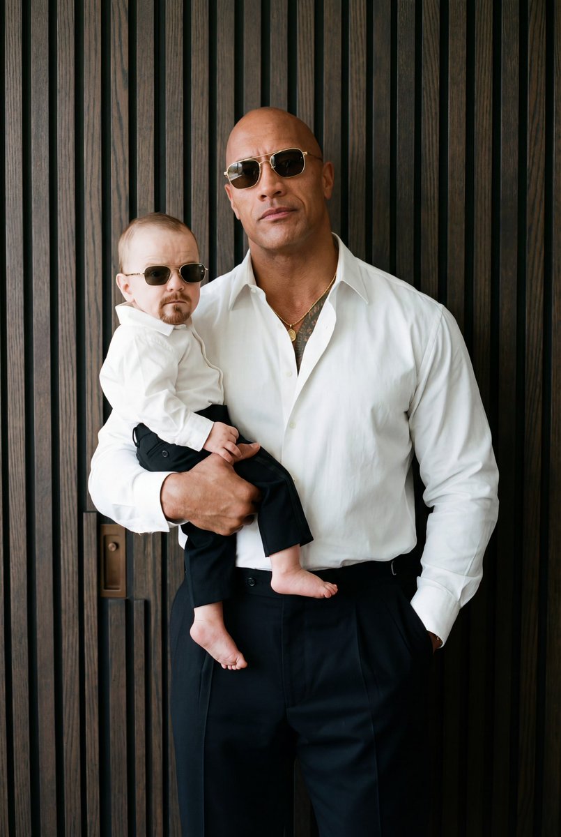 "prompt": "Use uploaded image ONLY for exact face identity of father & baby (no alteration). Ultra-realistic 90s editorial old-money portrait. Vertical 4:5, mid-thigh, subjects 70-80%, centered organic. Father relaxed lean, weight on one leg, right hand in pocket, left arm holding baby across torso. Baby diagonal, natural. Both direct gaze, serious quiet luxury. White slightly oversized wrinkled dress shirt (2-3 buttons open), high-waist black pleated trousers. Baby mini outfit. Thin gold frame sunglasses. Dark wooden slat background (visible texture). Soft diffused frontal light, slight film grain, muted tones, warm 90s grade. 85mm, f/2.8, eye-level.",