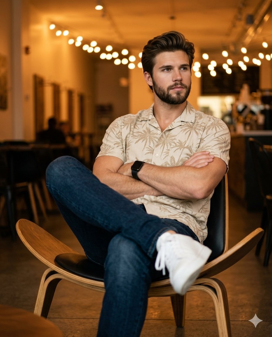 Ultra-realistic full-body portrait of a young man seated on a modern wooden lounge chair inside a cozy, aesthetically pleasing café. He is posed with legs crossed at the knee and arms folded across his chest, conveying a relaxed yet confident demeanor. His posture is natural and composed, with his head slightly turned to the side, expressing a calm, introspective mood. The subject features styled, voluminous hair and a full, well-groomed beard. He is dressed in a beige short-sleeve shirt with a subtle palm print pattern, paired with dark blue jeans, clean white sneakers, and a sleek black smartwatch, creating a contemporary casual look. The environment is warmly lit with ambient golden tones, enhanced by soft, out-of-focus string lights in the background producing a pleasing bokeh effect. The scene should have a shallow depth of field to isolate the subject while maintaining a cinematic atmosphere. Captured with a 50mm lens perspective, emphasizing natural proportions and realism. Ensure extremely high detail (8K resolution), sharp focus on the subject, accurate skin texture, and lifelike rendering. Preserve the exact facial features from the reference image without distortion. Color grading should lean toward a cinematic, warm, and inviting tone.
