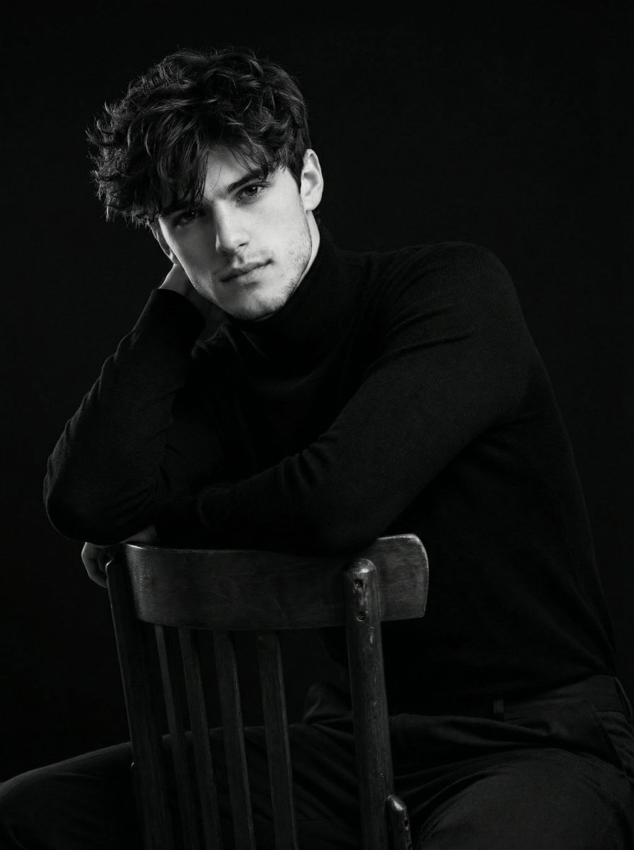 Ultra-realistic studio portrait of him leaning gracefully on the backrest of a chair, dressed in a sleek dark outfit. Shot from a subtle low-angle to accentuate his facial features and confident expression. Cinematic black-and-white color grade with refined, natural skin AK details, highlighting textures in her clothing, tones. Solid black background with sharp .hair, and eyes for a dramatic, lifelike effect