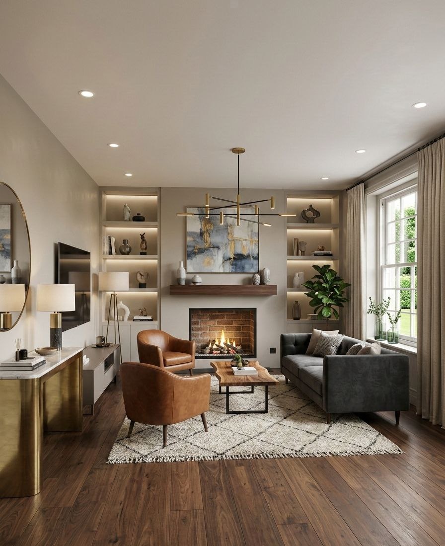 Ultra-realistic cinematic time-lapse renovation scene inside a residential living room under construction, dusty unfinished hall with exposed ceiling wires, scattered construction materials, bricks, insulation pieces, ladder near a fireplace, multiple construction workers wearing safety helmets and work uniforms rapidly working, electricians installing recessed ceiling lights and wiring, painters smoothing and painting walls in warm neutral tones, carpenters building shelves around a fireplace and installing a wooden mantel, flooring specialists laying rich dark wooden flooring, interior installers mounting a modern chandelier, furniture movers bringing a modern sofa, leather armchairs, wooden coffee table and patterned rug, decorators placing plants, books, sculptures and vases on illuminated shelves, curtains installed on a large window with sunlight streaming in, TV mounted on the wall with a modern console beneath it, lit fireplace creating a cozy warm glow, dust and construction debris disappearing as the room becomes clean and organized, transition from dull construction lighting to warm elegant interior lighting, final scene showing a modern luxury American living room, warm ambient lighting, elegant furniture, decorated shelves, wooden flooring, cozy atmosphere, hyper-realistic cinematic renovation moment, natural worker motion blur, extremely detailed interior, 4K photorealism, volumetric light, depth of field, wide angle interior shot.