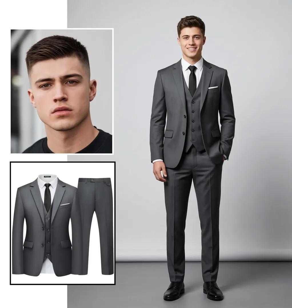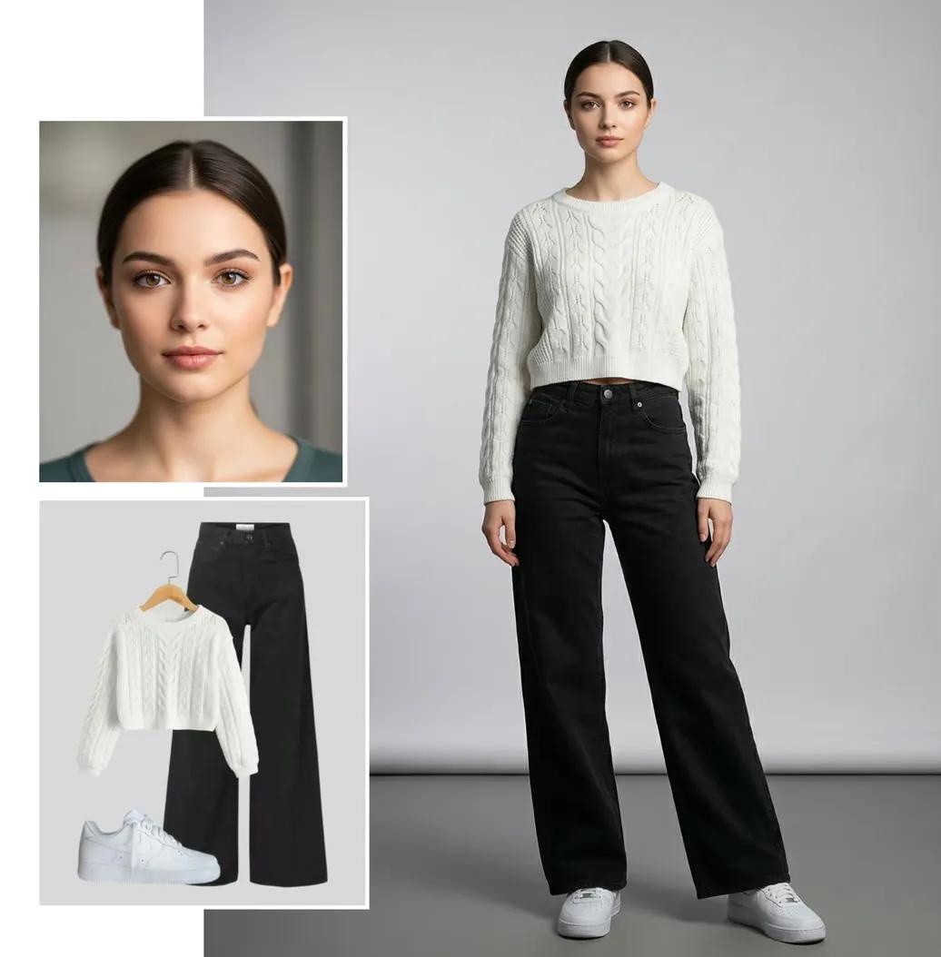 proportions, hairline, and overall likeness with high accuracy. Do not beautify, stylize, or alter their identity. Facial expression: calm, confident, or warm smile with direct eye contact toward the camera. Body Proportions Maintain realistic human proportions based on the person reference image. Preserve: body shape shoulder width natural posture Do not exaggerate body shape. Outfit Recreation The subject must wear the exact outfit from the outfit reference image. Recreate clothing accurately including: colors fabric type patterns and prints garment structure folds and stitching clothing layers The outfit should appear naturally worn and properly fitted to the subject. Pose Logic (Important) Do not copy the pose from any reference image. Instead, determine the pose based on the style of the outfit. Examples: Modern / streetwear outfits → relaxed modern fashion pose Formal outfits → confident professional standing pose Casual outfits → natural relaxed pose The pose should look like a professional fashion studio photoshoot. Composition Professional studio fashion portrait. Full body framing from head to toe (very important). Aspect ratio 4:5 vertical. Subject positioned naturally in the center of the frame. Background Create a clean professional studio sweep background. Background characteristics: smooth light grey seamless backdrop backdrop curves smoothly into the floor darker grey studio floor subtle gradient lighting on the background No objects or props. Lighting Professional studio lighting: soft front key light balanced fill light subtle rim light for separation evenly illuminated background Lighting must look natural and professional. Image Style Ultra-realistic studio photography. Requirements: photorealistic skin texture detailed fabric rendering sharp focus natural shadows professional fashion photography look Restrictions No extra people No text No logos No props No background objects No half-body portrait Subject must be fully visible from head to toe