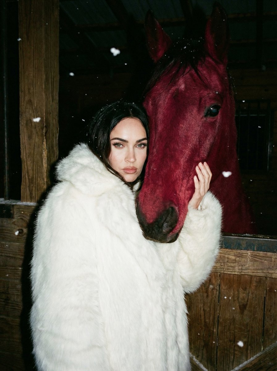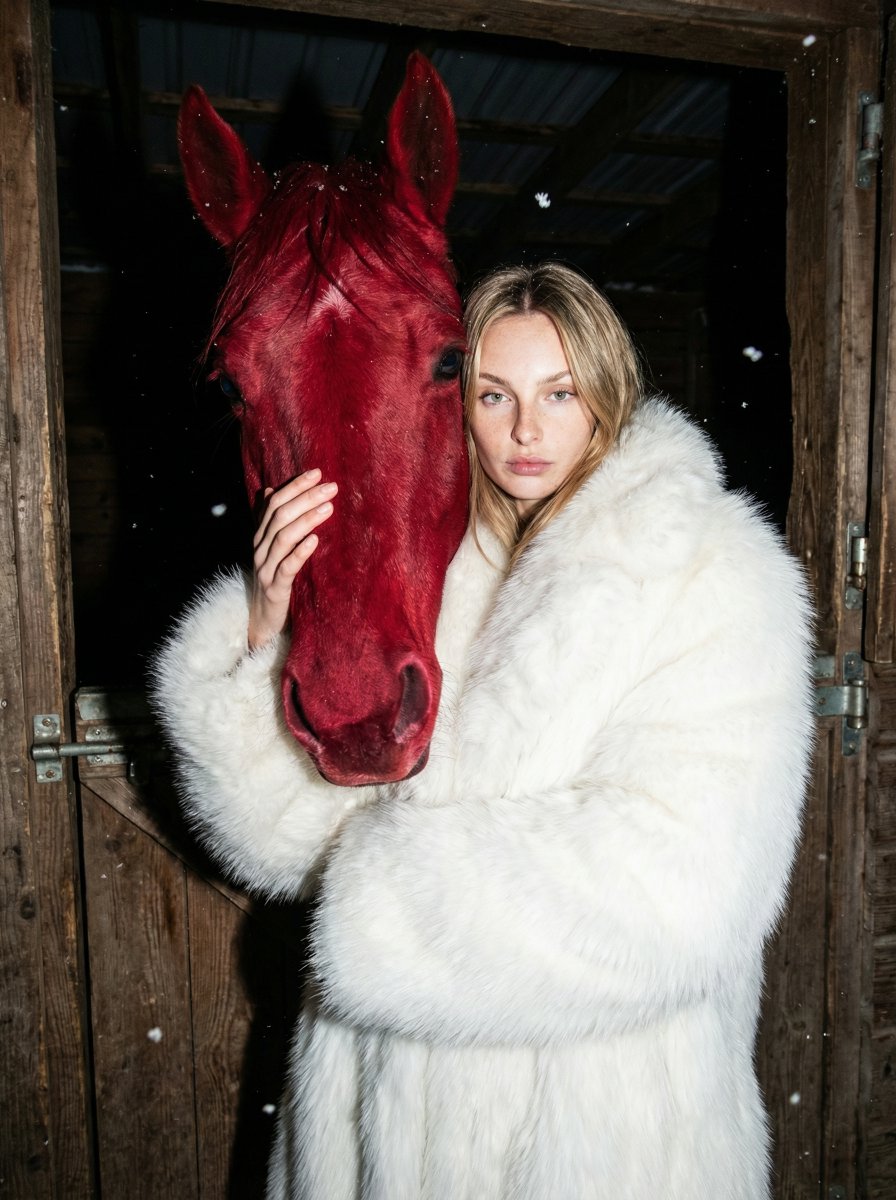 keep the real face preserve exact facial features and identity, no beautification, no stylization. ultra-realistic raw nighttime photograph with direct flash, a woman stands inside a wooden stable at night, pressed closely against a deep red horse. the horse's coat is an intense unnatural crimson, matte and dense, sharply contrasting with the dark environment. snowflakes are frozen in the air by the flash. she wears an oversized pure white fur coat, extremely voluminous and fluffy, with long dense pile, heavy and luxurious, wrapping her body completely, clean cold white, no tint. pose: she holds the horse's head gently but firmly, one hand along its face, posture calm and grounded. head upright, direct gaze into the camera, serious, composed expression. environment: rough wooden stable interior, worn planks, cold night atmosphere, slight snow drifting inside. lighting: harsh on-camera flash, extreme contrast between white fur, red horse, and darkness. deep shadows, hard edges, visible grain, camera & style: close chest-up framing, eye- level. raw flash photography, documentary realism, strong textures, mood: cold power, surreal contrast, luxury versus raw nature, quiet dominance