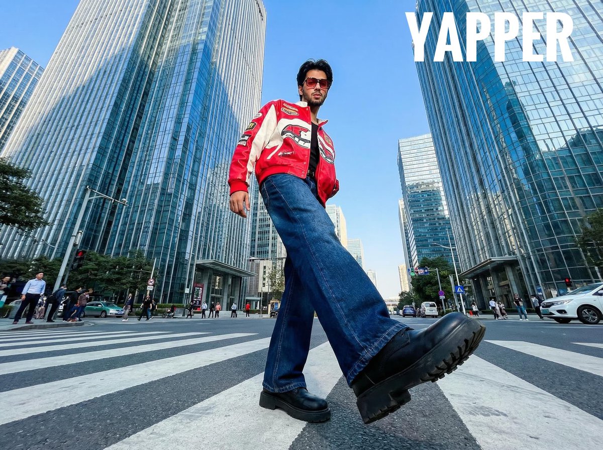 ULTRA-WIDE-ANGLE STREET FASHION PHOTOGRARHOF AYOUNG MAN CROSSING A CITY CROSSWALK IN A MODERN FINANCIAL DISTRICT SURROUNDED BY TALL GLASS SKYSCRAPERS. SHOT FROM AN EXTREMELY LOW ANGLE NEAR GROUND LEVEL WITH A 14-18MM FISHEYE LENS, CREATING DRAMATIC PERSPECTIVE DISTORTION ONE LEG STEPPING FORWARD TOWARD THE CAMERA, SHOE DOMINATING THE FOREGROUND, ELONGATED PROPORTIONS FOR A BOLD, DYNAMIC EFFECT. HE WEARS OVERSIZED DARK BLUE FLARED JEANS, CHUNKY BLACK BOOTS, A RED AND WHITE STATEMENT JACKET WITH GRAPHIC PATCHES,, AND TINTED RED SUNGLASSES, CONFIDENT, EFFORTLESS EXPRESSION, SLIGHTLY LEANING FORWARD INTO THE FRAME ENVIRONMENT DETAILS: WIDE ZEBRA CROSSING LINES LEADING INTO THE DISTANCE, PEDESTRIANS WALKING BEHIND HIM, CARS WAITING AT THE INTERSECTION, CLEAR BLUE SKY, SLEEK CORPORATE TOWERS REFLECTING LIGHT. URBAN ASIA-INSPIRED METROPOLIS AESTHETIC. LIGHTING & STYLE: BRIGHT NATURAL DAYLIGHT WITH SUBTLE DIRECT FLASH FOR CRISP CONTRAST. HIGH CLARITY, SHARP FOCUS, DEEP SHADOWS, VIBRANT BUT REALISTIC COLORS. EDITORIAL STREETWEAR CAMPAIGN VIBE, Y2K ENERGY, FASHION MAGAZINE LOOK. CAMERA FEEL: GROUND-LEVEL PERSPECTIVE, EXAGGERATED SCALE, IMMERSIVE DEPTH, CINEMATIC COMPOSITION, SLIGHT VIGNETTE NATURAL SKIN TEXTURE, NO HEAVY RETOUCHING.