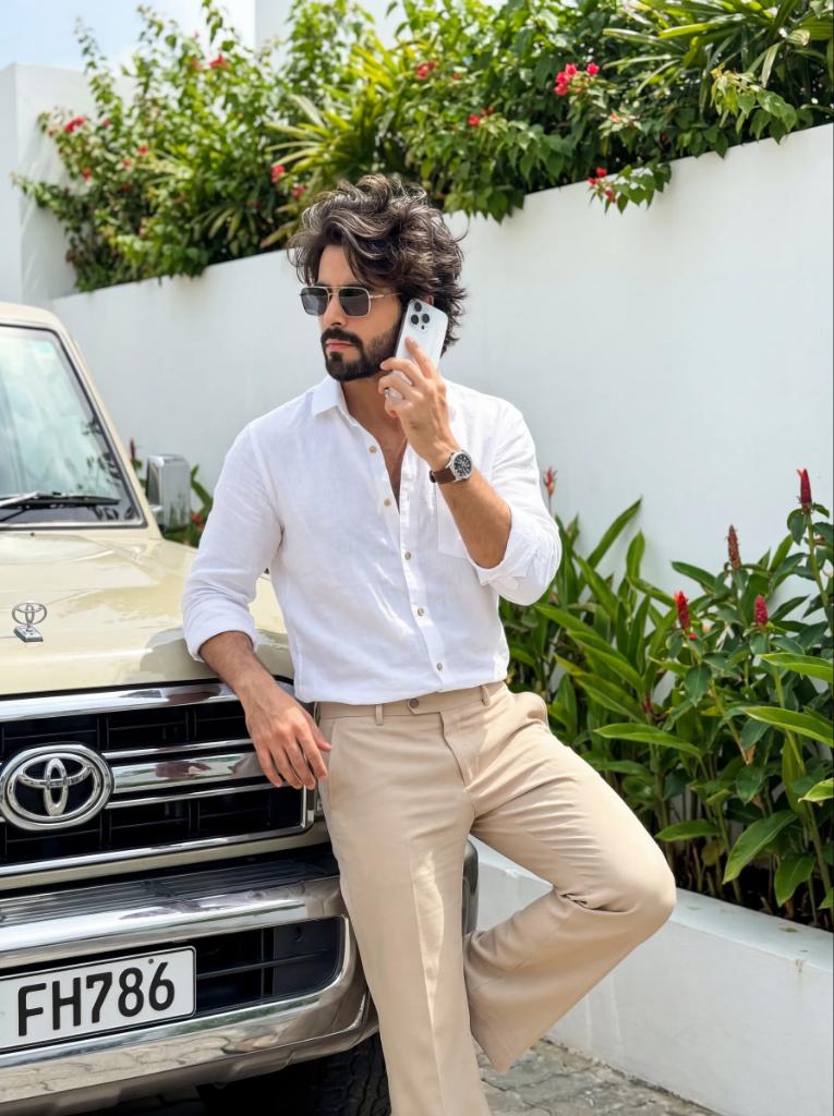 Create ultrarealistic image of an stylish boy with messy volume stylish hair cut,standing outdoors in bright natural sunlight leaning on Land Cruiser and talking a call on white iPhone 17 pro max, car number FH786 wearing white Lenin 2 open button shirt, pant is beige bell bottom. He is wearing square sunglasses and a wristwatch, a natural pose. Confident and calm expression, looking sideways. Background features a clean white wall covered with lush green plants and small red flowers