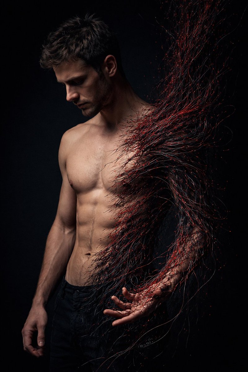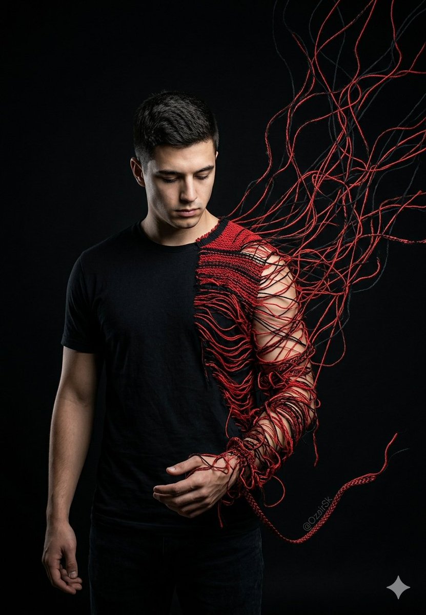 A standing male figure, photographed from the waist up, whose entire right arm and shoulder is slowly unraveling into {argument name="thread colors" default="thousands of red and black threads"} like a sweater being pulled apart the threads float and drift upward into darkness above. His face is {argument name="expression" default="stoic"}, looking down at his dissolving hand with quiet acceptance. Background is a {argument name="background" default="deep matte black"}. Left side of body is perfectly normal, photorealistic skin. The contrast between the real and the unraveling is the entire story. Studio lighting, single soft key light from the left. Thread textures ultra-detailed, each strand individually visible. On one of the longer drifting threads near the bottom, visible only on close inspection. Vertical 9:13 format.Related Nano Banana Pro Prompts