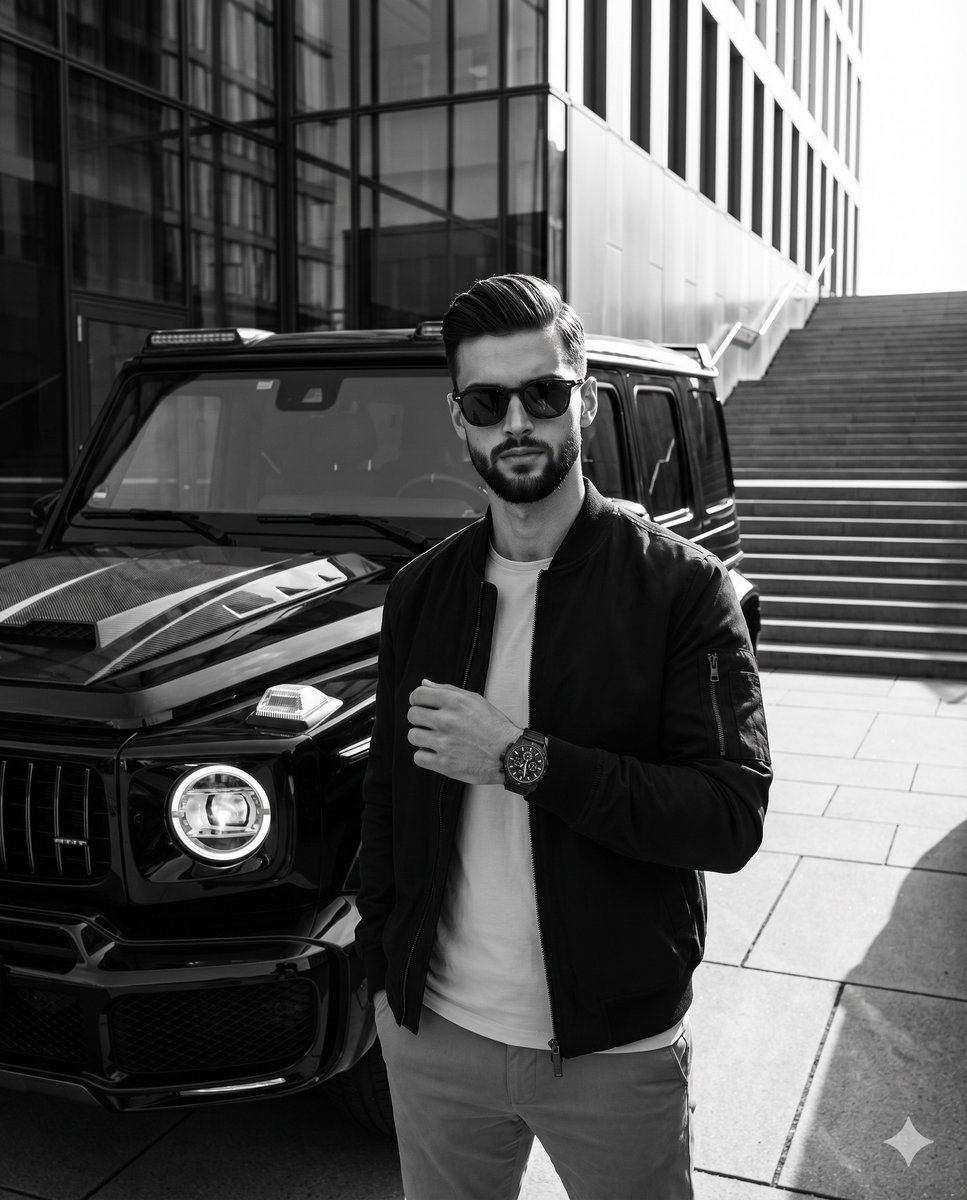 A confident {argument name="subject" default="young adult male"} stands perfectly centered facing the camera, dressed in a {argument name="jacket" default="dark bomber jacket"} over a light t-shirt and light trousers, his eyes completely concealed by thick dark sunglasses above a neutral, closed mouth. His strikingly textured quiff, with short clipper-faded sides transitioning to a two-to-three-inch top pushed back and slightly to the right, features straight to slightly wavy natural sectioning held by matte clay, revealing slight front unevenness and delicate natural flyaways catching the light against the dark background. Deliberately posed, his right hand is casually tucked into his trouser pocket, while his left arm bends at the elbow, raising his hand to mid-torso with the wrist turned outward to prominently display a {argument name="accessory" default="luxury dark chronograph watch"}, his fingers softly curled inward against his jacket with the thumb resting lightly along the top edge of the curled index finger. He stands in a pristine outdoor commercial plaza defined by a floor of light gray concrete slabs intersected by dark linear expansion joints. In the left midground, a dominant, glossy black Mercedes-Benz G-Wagon SUV commands the space, showcasing a distinctive rectangular grille, a carbon fiber hood scoop, and a glowing round headlight with a halo DRL. Extending into the deep background on the top left is a modern architectural facade of perfectly smooth, dark gray glass and vertical metal fins deeply reflecting the surrounding environment, while to the right, a pristine wide-tiered concrete staircase ascends, bordered by a minimalistic metal handrail casting diagonal shadows. The entirely monochromatic, high-contrast black and white scene exudes a dramatic, polished urban luxury mood, illuminated by an intensely bright, highly directional natural sunlight striking from a 45-degree angle on the right. This hard light sculpts brilliant specular highlights onto the right side of the man's face, the bright concrete ground, and the glossy black paint of the car's hood and fenders, while simultaneously casting medium-length, deep black shadows with harsh, defined edges onto the ground to his left, across the left side of his face and jacket, and deep within the vehicle's grille. Captured as a realistic, tack-sharp digital streetwear editorial photograph from a straight-on perspective, the image utilizes a 35mm or 50mm lens at f/8 and 1/1000s shutter speed with ISO 100 to achieve a deep depth of field that seamlessly keeps the subject, vehicle, and architecture in perfect focus, enhanced through stark post-processing that crushes blacks, boosts whites, and aggressively elevates clarity, all seamlessly framed in a 4:5 aspect ratio.Related Nano Banana Pro Prompts
