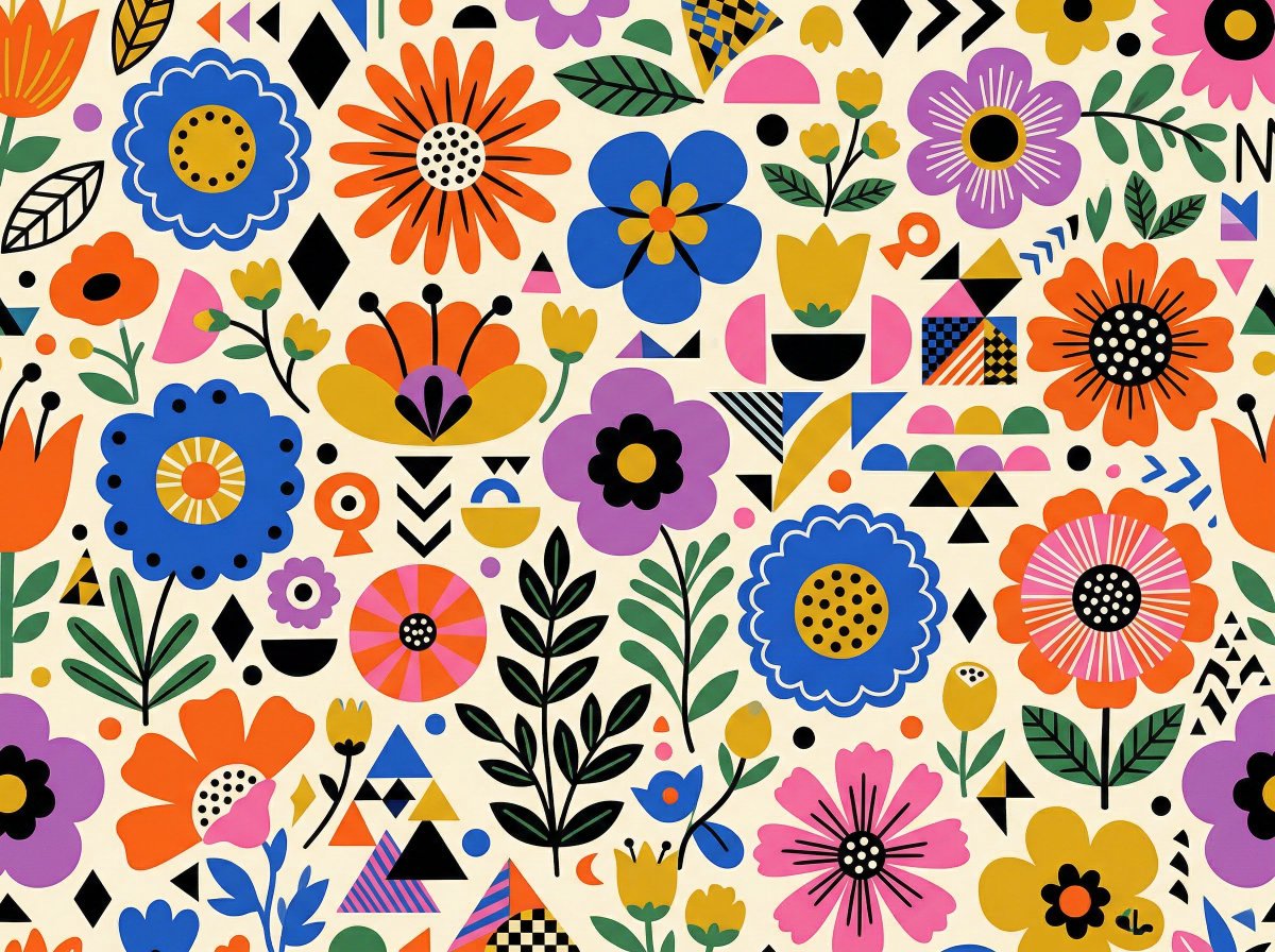 A vibrant, flat illustration features a repeating pattern of stylized flowers and geometric shapes on a cream background. The composition is densely packed with various floral motifs in bold, primary colors like orange, blue, pink, yellow, and purple, interspersed with black and green elements. The flowers vary in design, from simple, rounded petals to more intricate, abstract forms. Some have distinct centers, while others are solid colors. Geometric shapes, such as diamonds, triangles, and semi-circles, are strategically placed throughout the pattern, adding a graphic quality. The overall style is reminiscent of mid-century modern design or folk art, with a playful and cheerful aesthetic. The colors are flat and unshaded, and the lines are clean and defined.