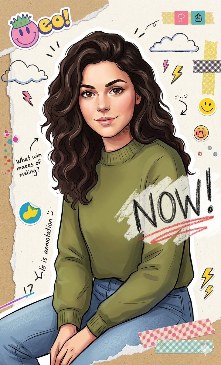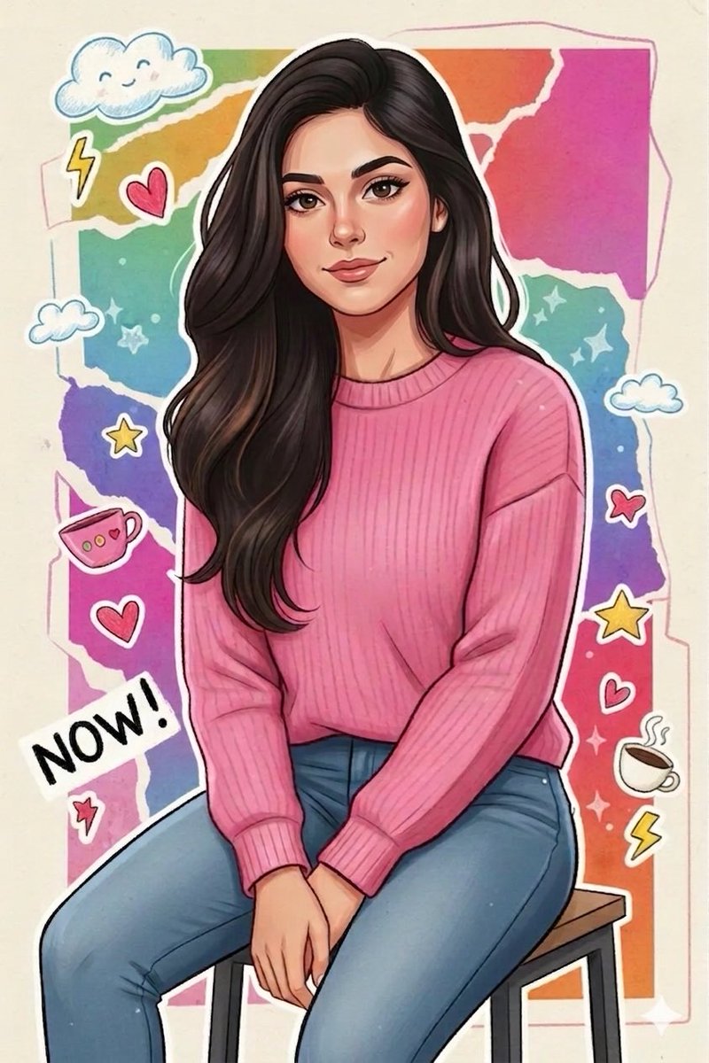 A high-resolution, highly detailed 2D digital illustration in a vibrant sticker art style. Soft, even lighting illuminates a centered medium portrait of a young woman [ use the uploaded photo as reference] with long dark wavy hair, wearing a ribbed pink sweater and blue jeans, sitting on a stool. She features a thick white sticker-like outline. The background consists of a torn paper effect revealing a bright rainbow gradient. Scattered around her are cute doodle stickers including a smiling cloud, hearts, stars, lightning bolts, coffee cups, and a text cutout reading "{argument name="text cutout" default="NOW!"}". The overall mood is cheerful, youthful, and energetic.Related Nano Banana Pro Prompts
